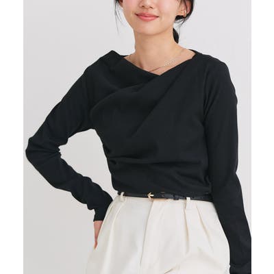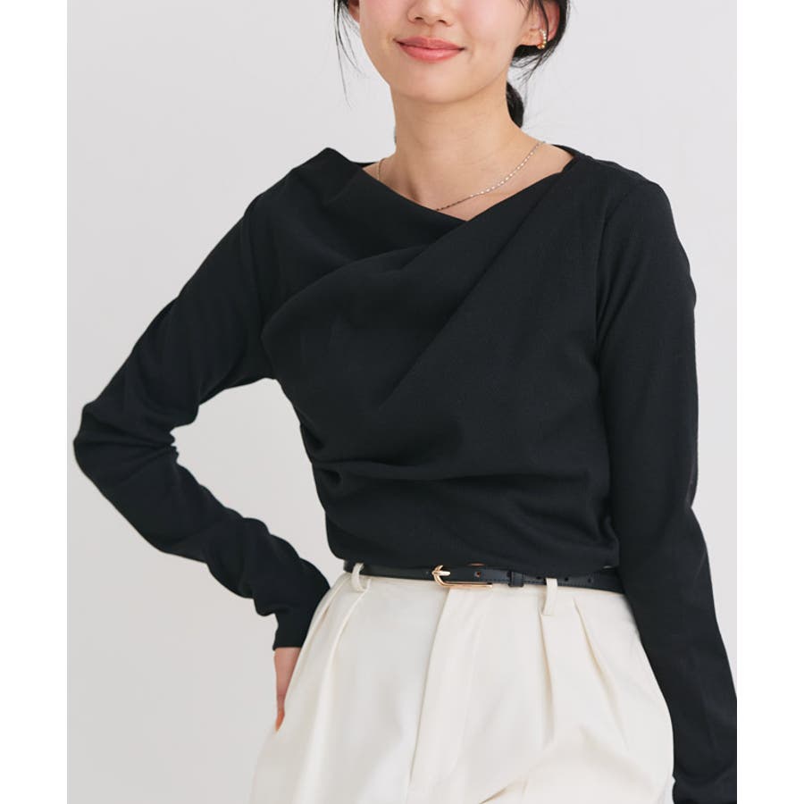 衿元の上品なドレープデザインで顔周りをすっきりした印象に。程よいフィット感で合わせるボトムスを選ばない、シンプルで女性らしいデザインです。