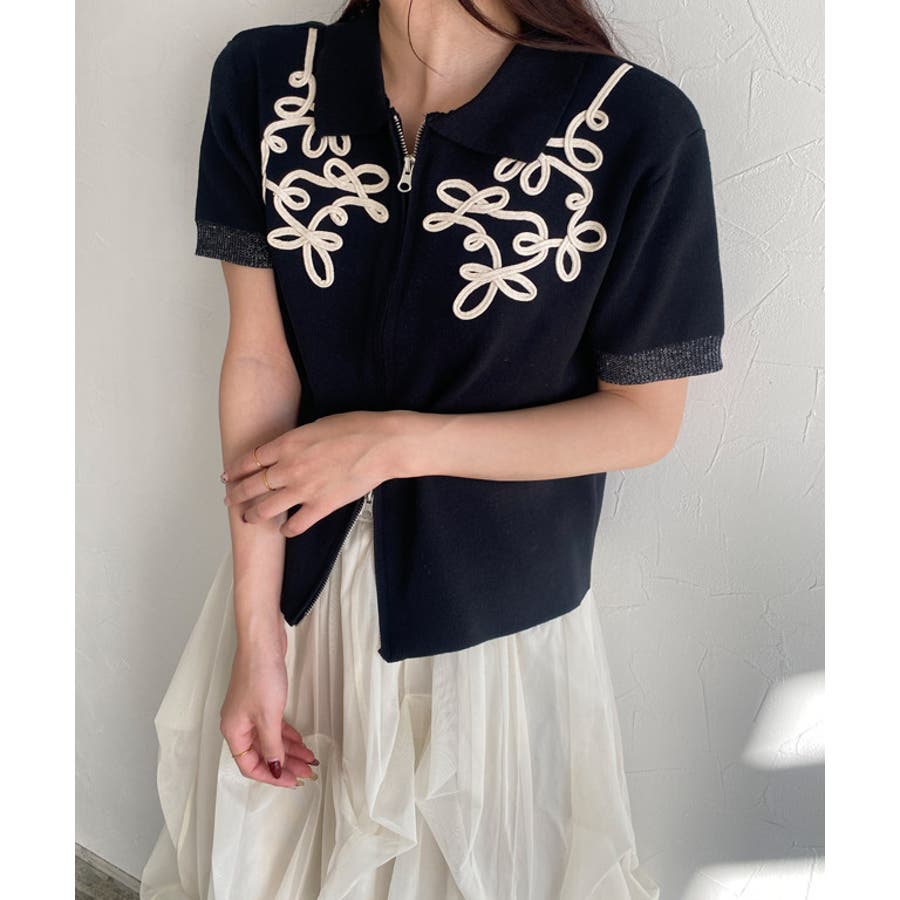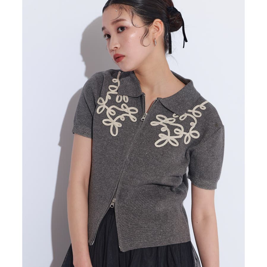 フロント部分に施したコード刺繍がトレンドライクなニット。程よく短いクロップド丈とダブルジップデザインが今っぽい印象に導いてくれます◎