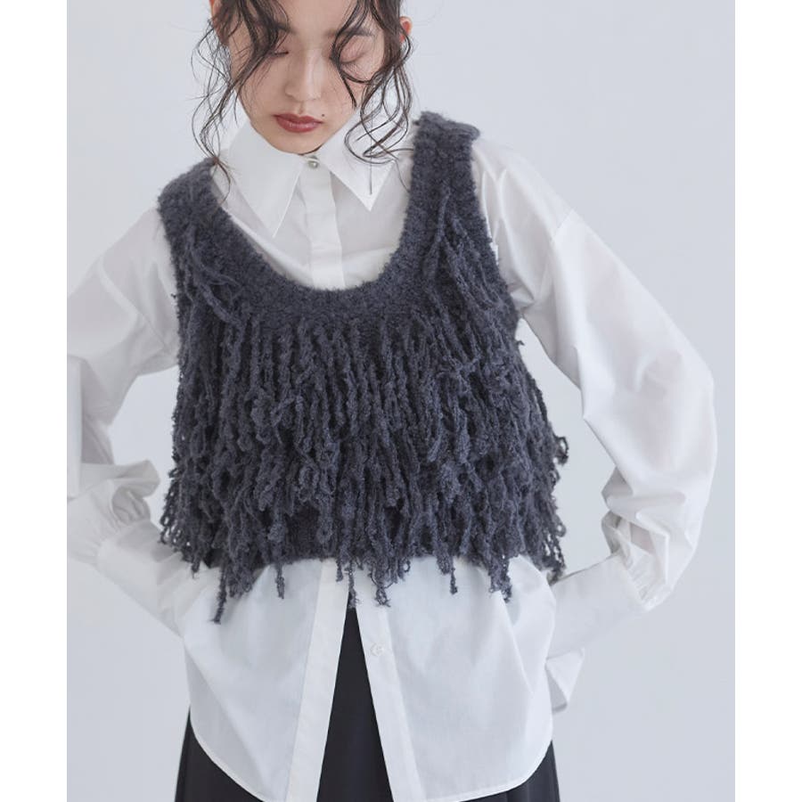 表情豊かなループヤーンを贅沢に使用した存在感抜群のニットベスト。ふんわりとした立体感が特徴でシンプルなコーディネートに一枚取り入れるだけで旬の着こなしに。ゆるやかなUネックが抜け感と女性らしさを引き立ててくれます。