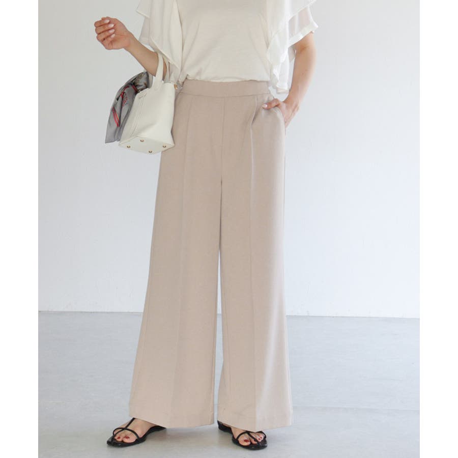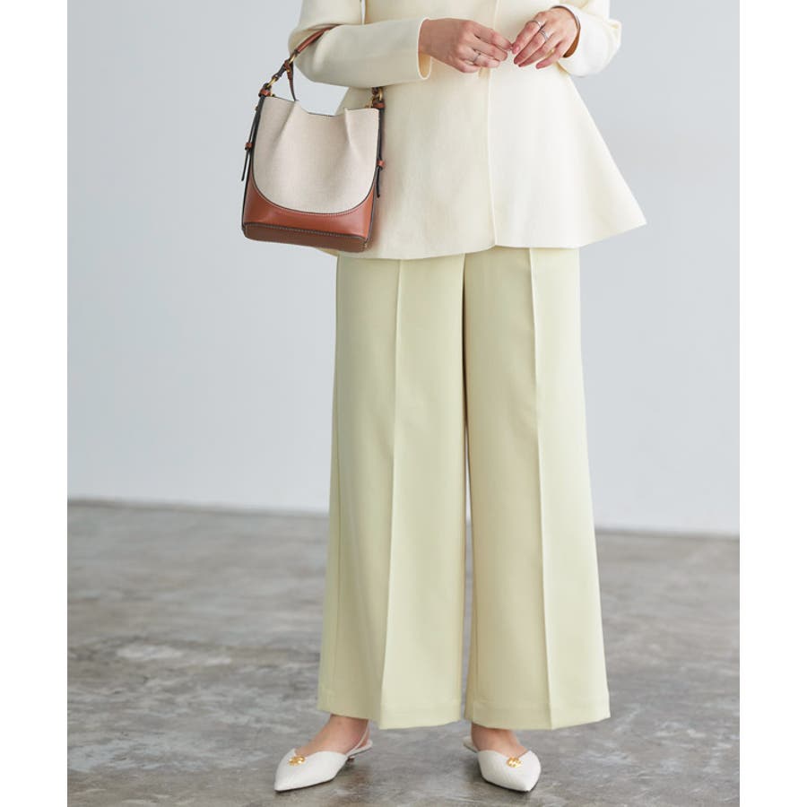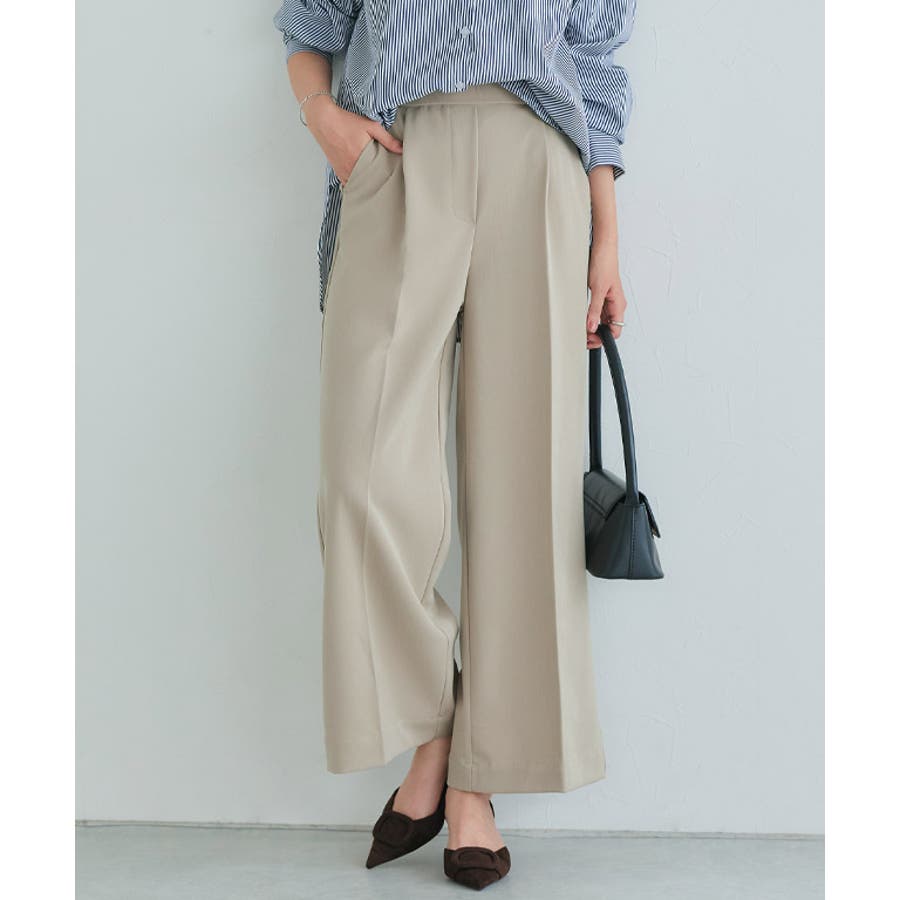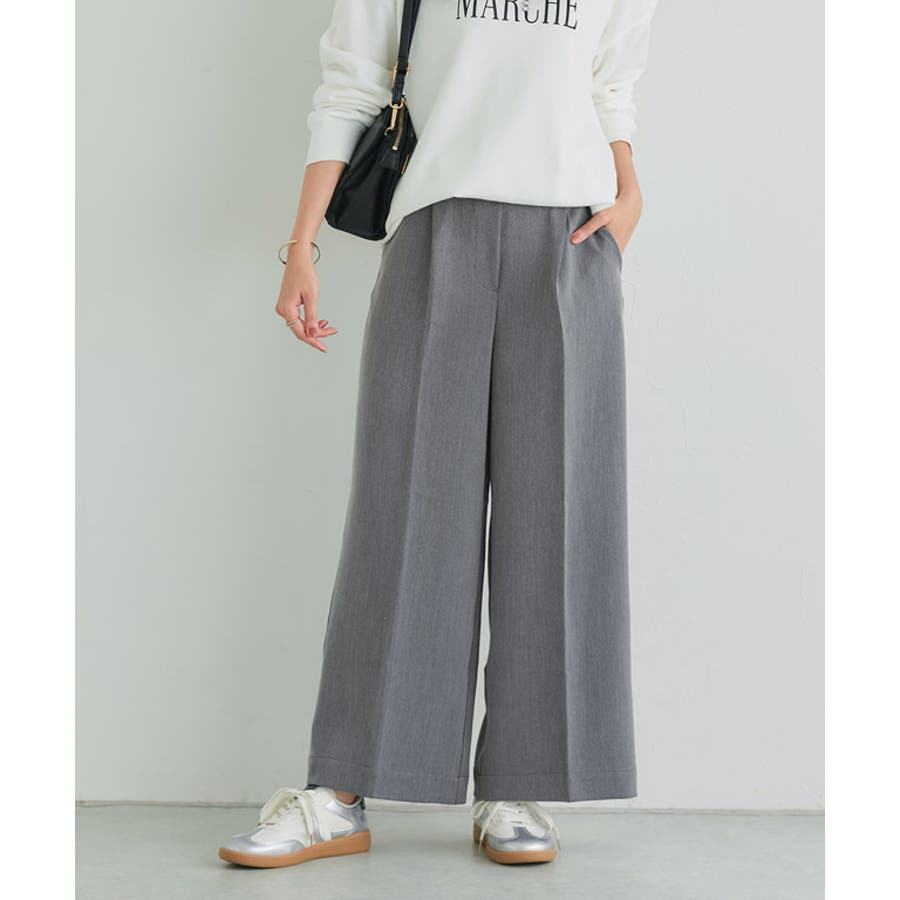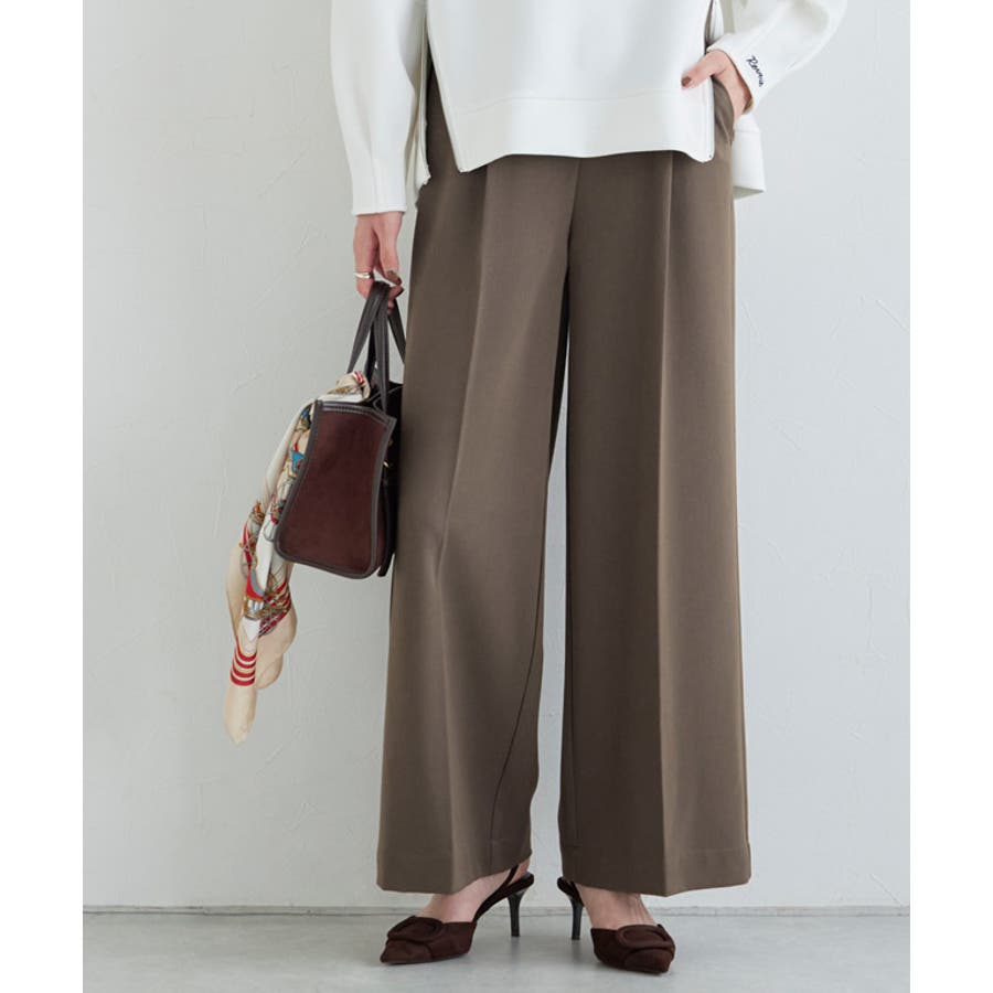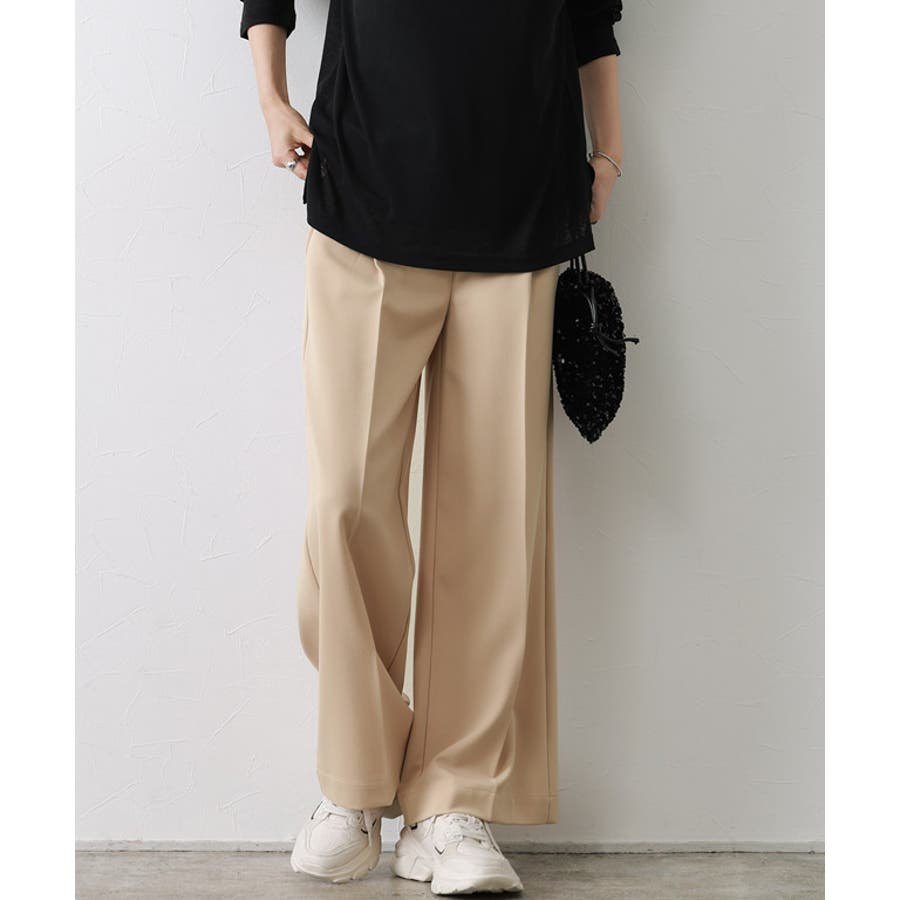 前の幅を裾に向かって小さくすることですっきり見えします。足のラインを拾いにくいワイドシルエットで、リラクシーながらもセンタープレスがきちんと感を演出してくれる一枚。ジップ部分をフェイクカバーにすることでリアルパンツに近いデザインに。ウエストは後ろゴムで楽な穿き心地に、前はフラットなのでインスタイルもすっきりときれい見えします。ONOFF問わず合わせやすい一枚に仕上げました。