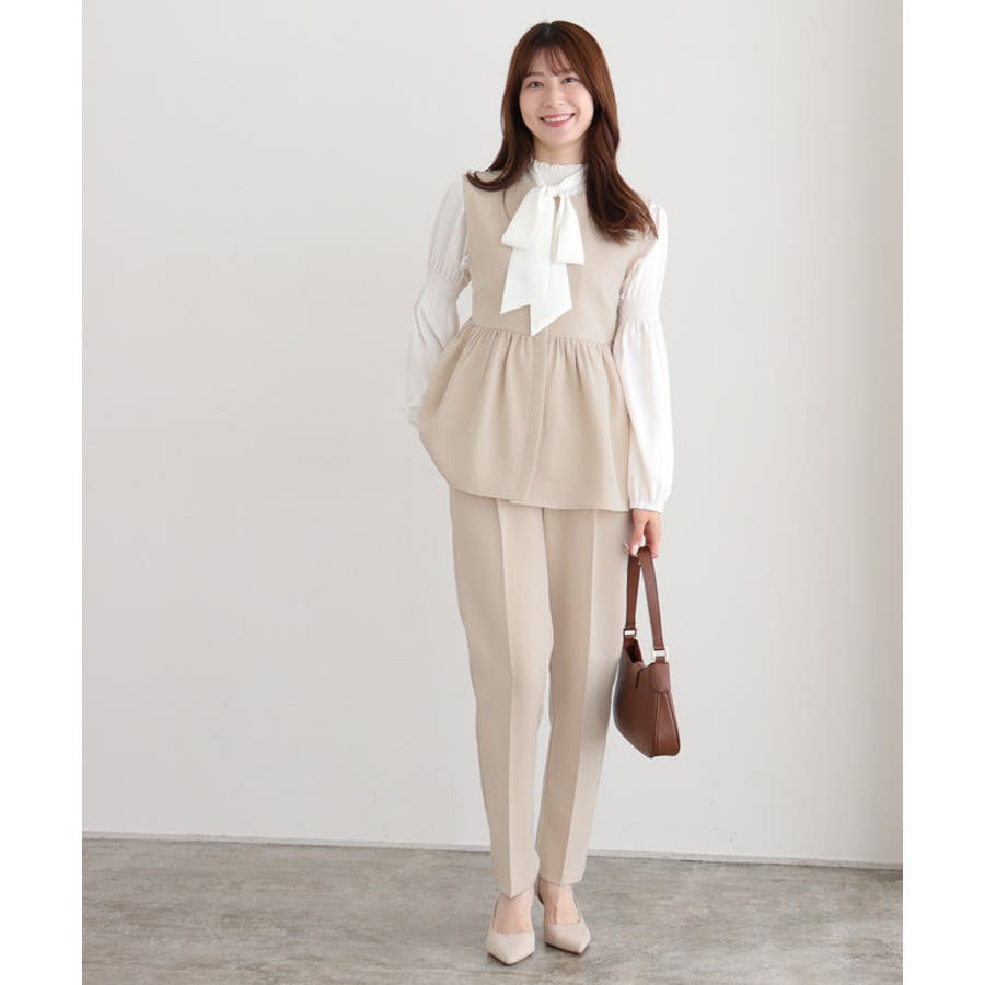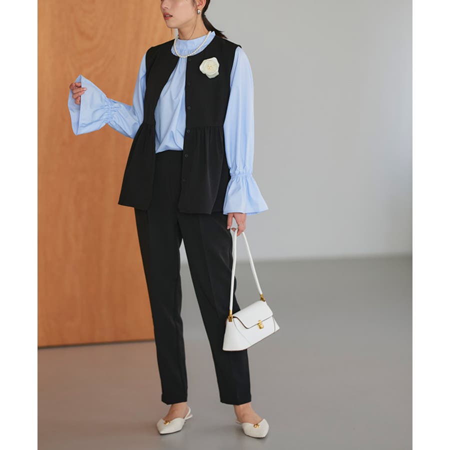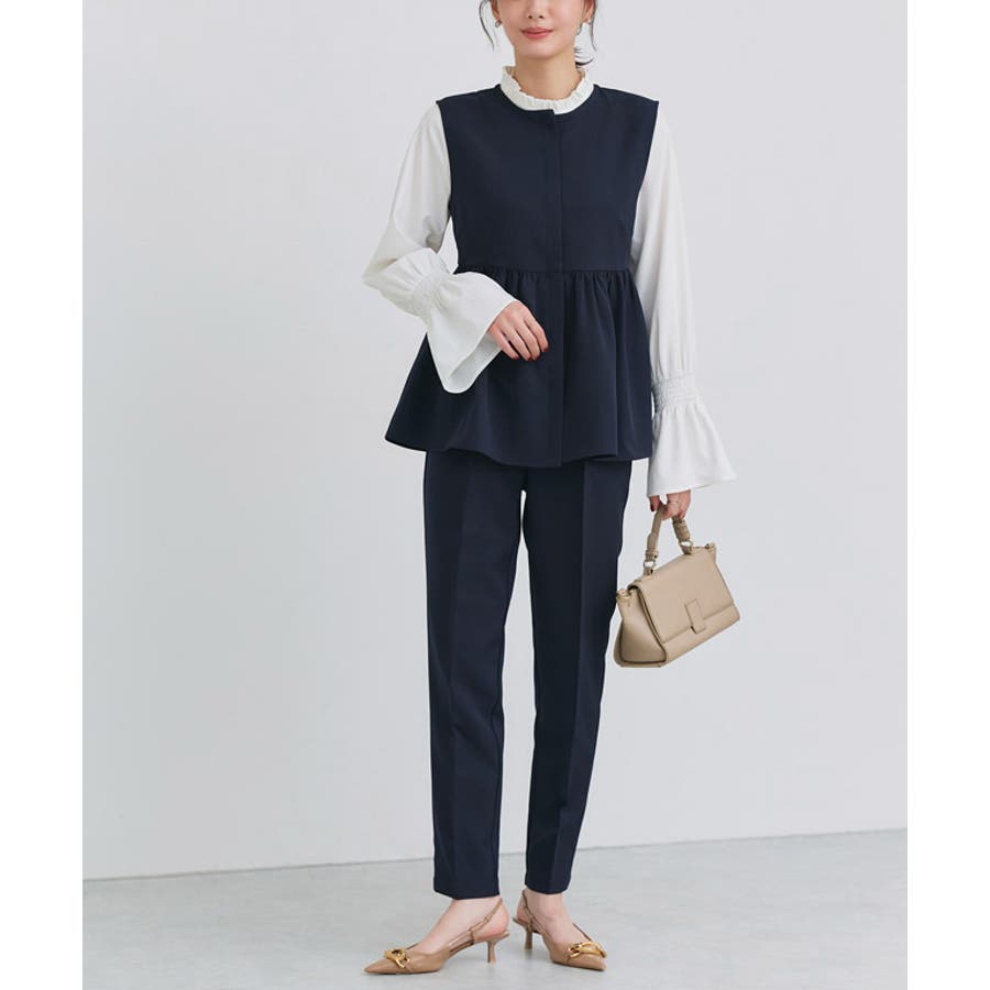 フェミニンな雰囲気に導きつつ、ウエスト周りのカバーもしてくれるペプラムディテール。ジレタイプなのでインナー次第で様々なシーンで活躍します◎パンツはすっきりと見えるテーパードシルエットにセンタープレスを施しきれいめな印象をプラス。セットアップではもちろん、別々でも使えるので着こなしの幅が広がる一枚です◎