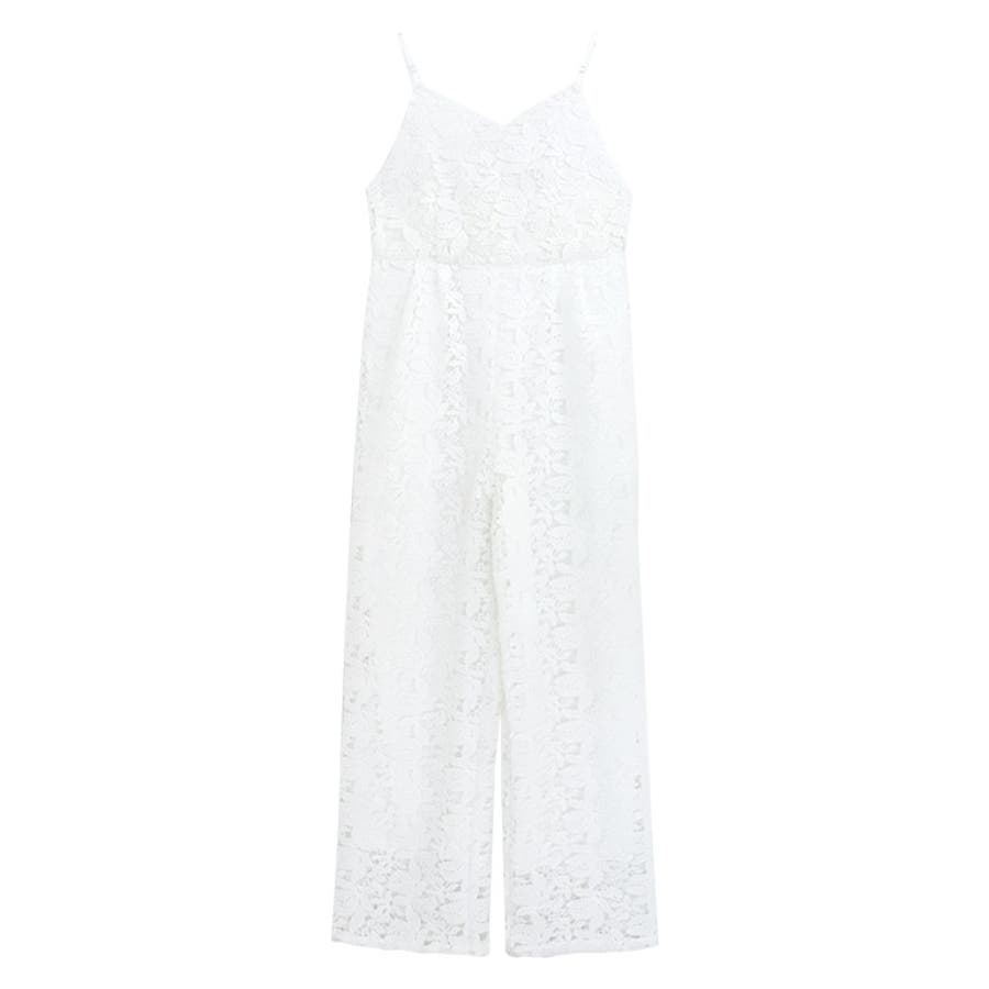 厚みとハリ感のあるレース素材を使用することで綺麗なシルエットをキープ。大振りの花柄レースが女性らしさ溢れるオールインワンです。