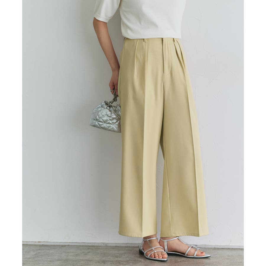 ウエスト周りのタックとセンタープレスがすっきりと見せてくれ、スタイリングにきちんと感もプラスします。脚のラインを拾いにくい絶妙なシルエットにすることでON/OFFと合わせやすく、デイリーに使える一枚に仕上げました。
