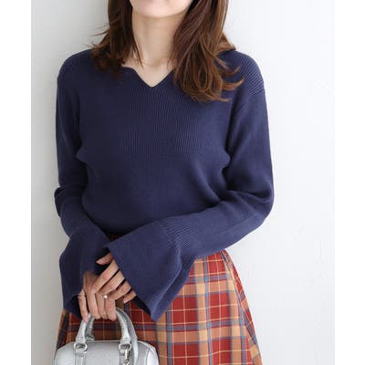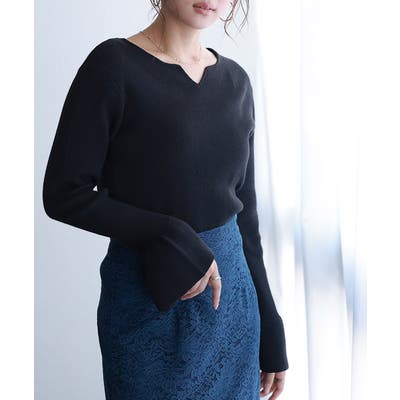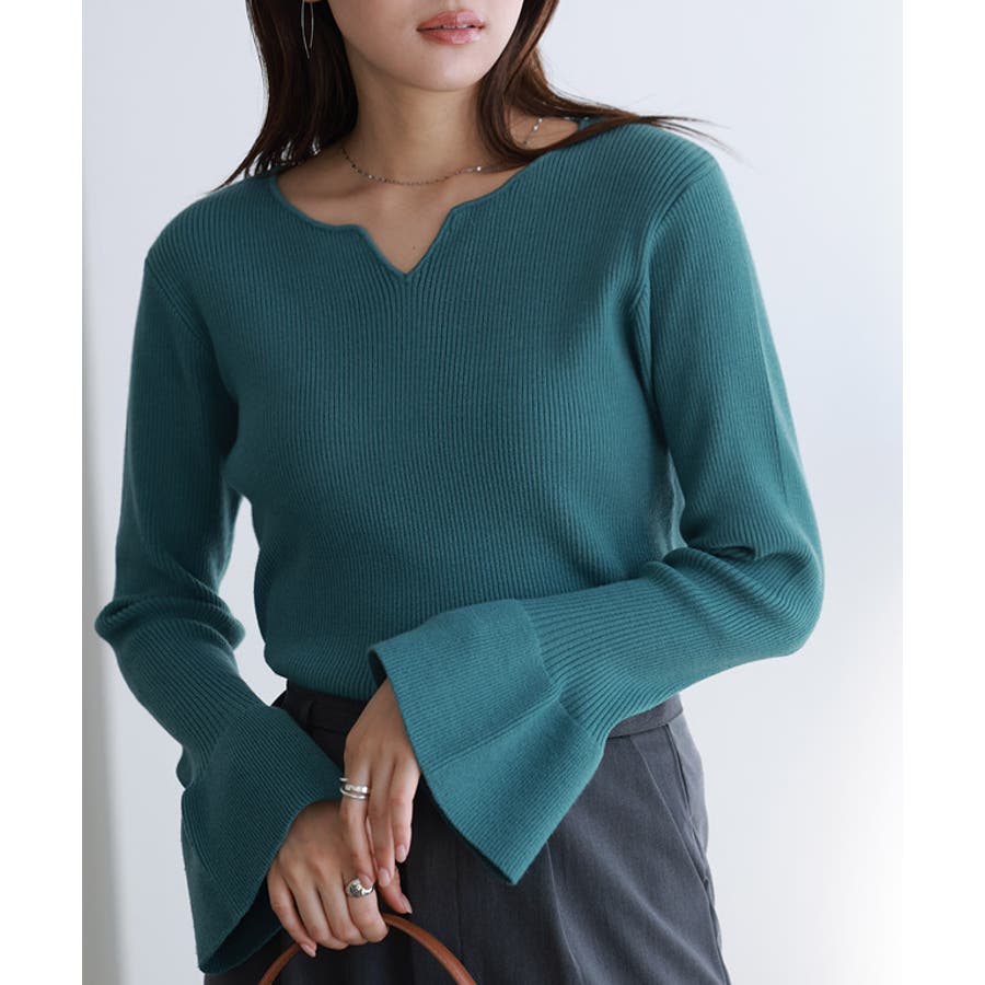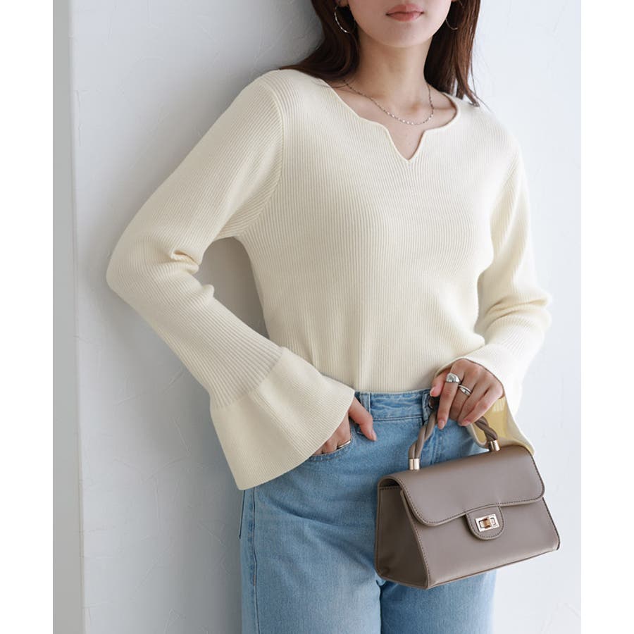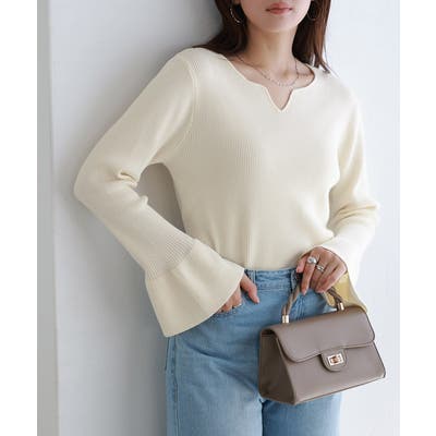袖口にかけて広がるフレアスリーブが、女性らしさをより引き立ててくれる上品ニット。首元がすっきりして見えるキーネックデザインにし、抜け感をプラスしました。ON/OFF着回しの効く一枚です。