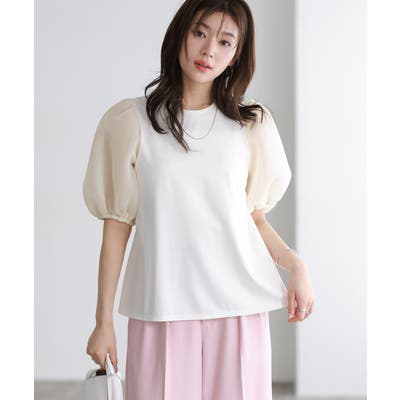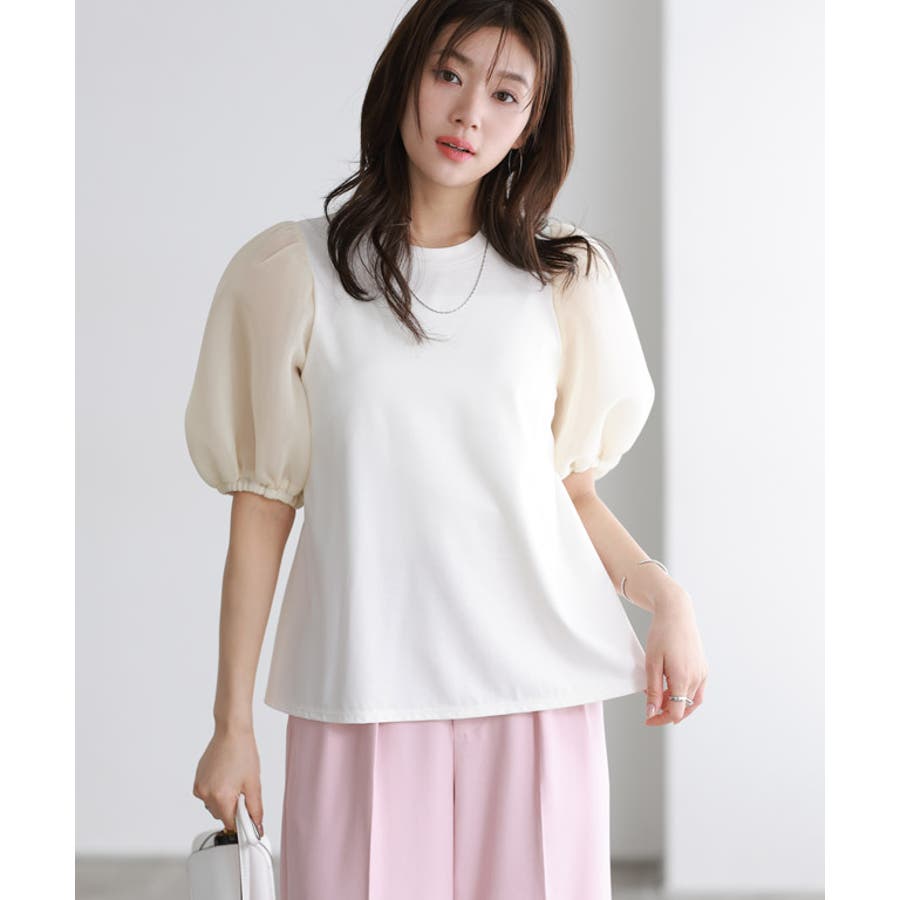 身頃はさらりとした着心地が魅力的な素材で、袖部分はシアー感のあるダンボール素材を使用し、ハリ感がきれいなシルエットをキープしてくれ、程良いシアー感がトレンドライクな装いへと導いてくれます。