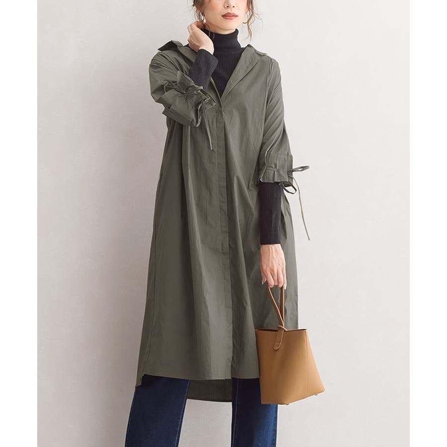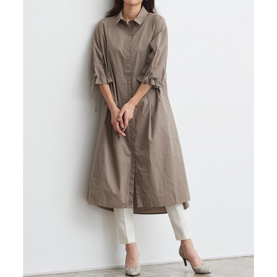 袖の立体感のあるタックデザインがアクセントになるロングシャツ。リボンを絞ることでボリュームを調節でき、細めのリボンがさりげなくフェミニンさ漂う一枚です。フロントの比翼デザインがチュニックとして着用した時にすっきり見えし、ボタンを開けて羽織としても着用可能です◎