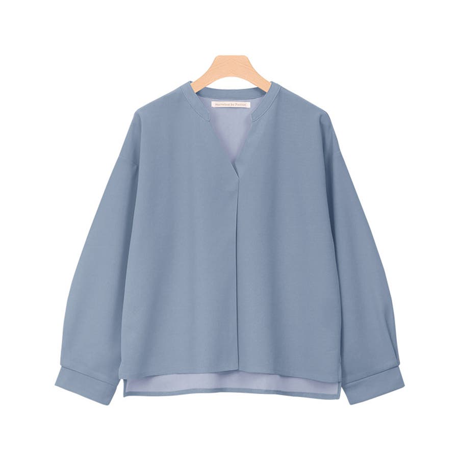 上品ですっきり見えするノーカラーデザイン。フロント部分に施されたタックが程よいゆとりをプラスし、袖口にスリットを入れることで抜け感のあるデザインに。
