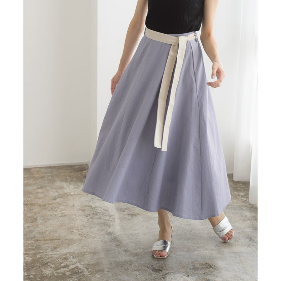 麻混配色ベルトフレアスカート フレアスカート フレア ロング丈 ミモレ丈 膝下