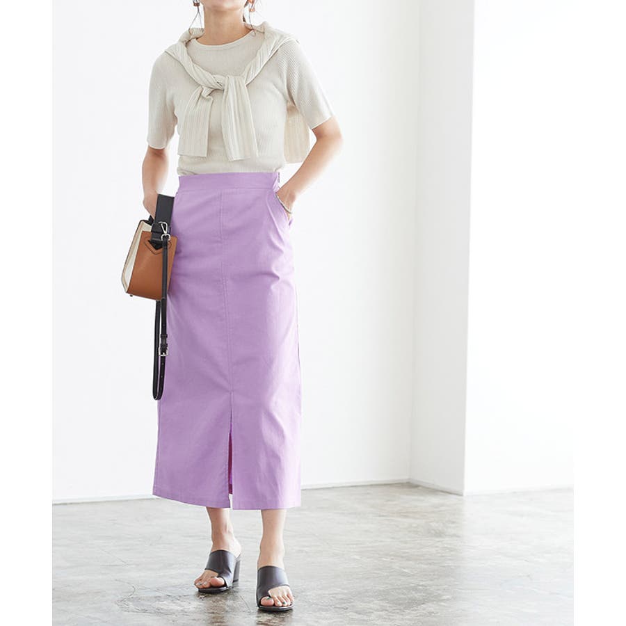 裾に向かってやや広がるシルエットとロング丈が女性らしさ漂う一枚。フロントスリットは足さばきもしやすく、足元の抜け感もプラスしてくれます。