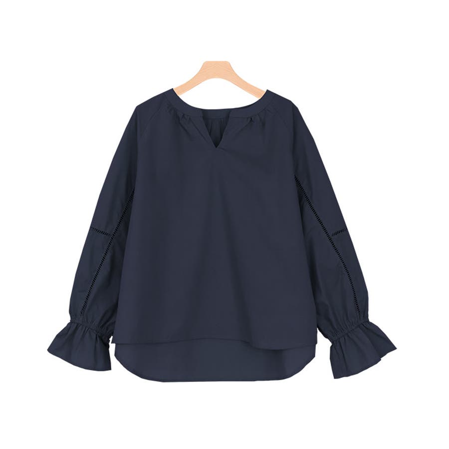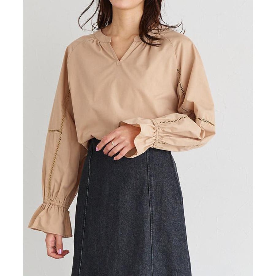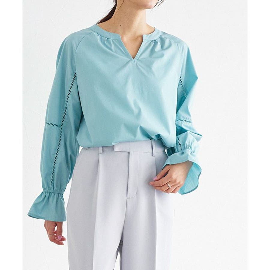 袖に施したハシゴレースがシーズンムード漂うブラウス。キャンディスリーブで女性らしいティテールを加え、首元は抜け感のあるキーネックに仕上げました。甘すぎず一枚で着映えて、着回しやすい一枚です。