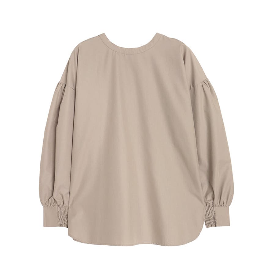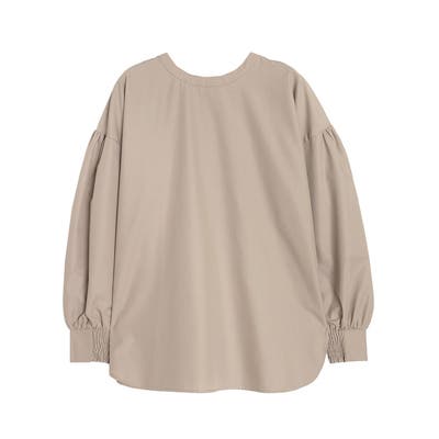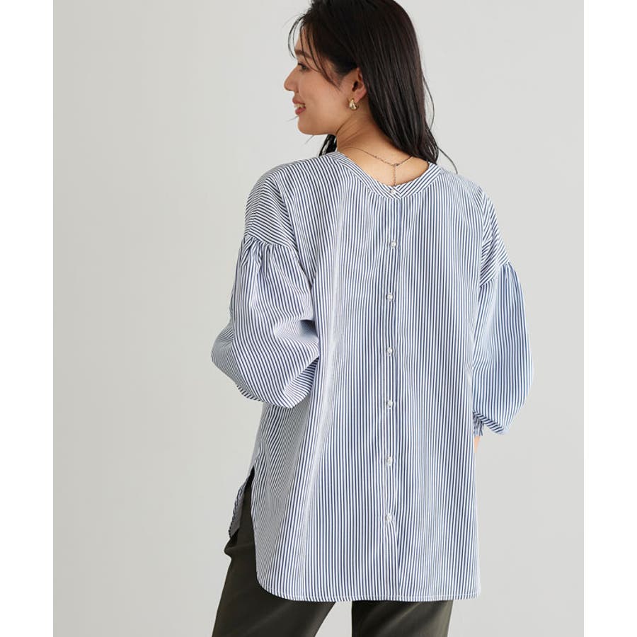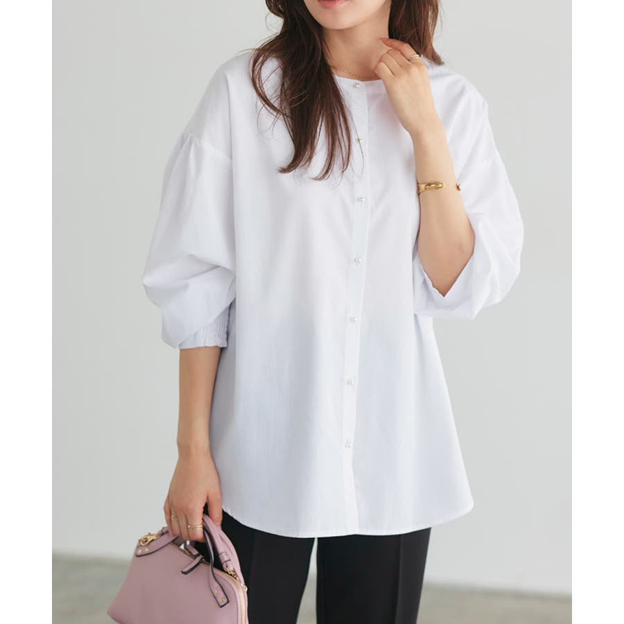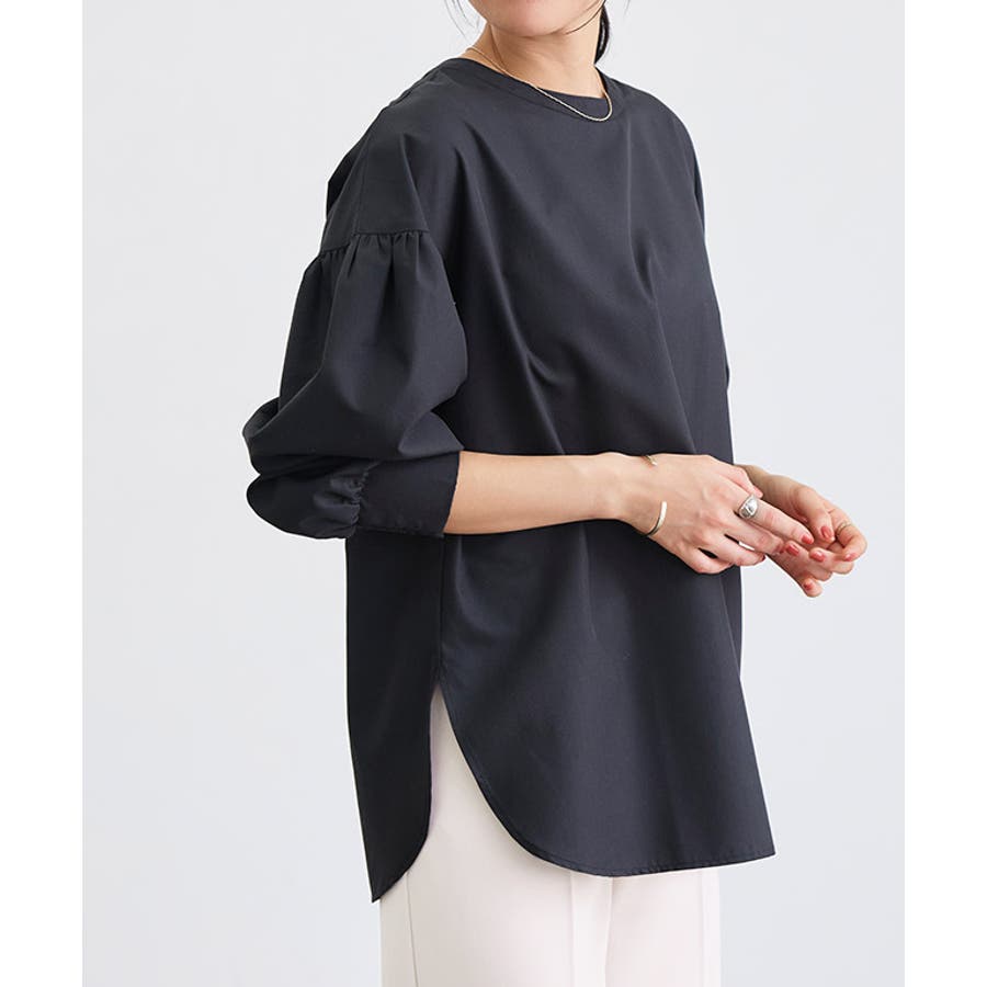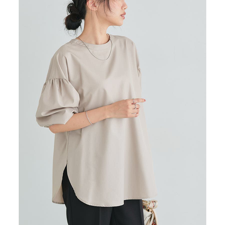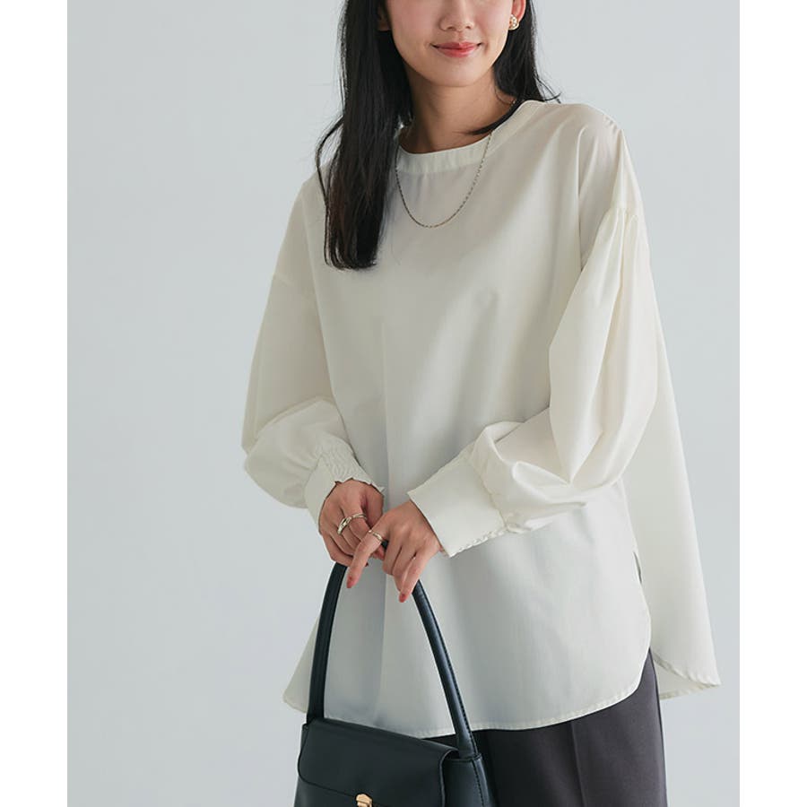 パールボタンがフェミニンなアクセントになったブラウス。程良くルーズなシルエットとお尻まで隠れる丈で体型カバーしつつこなれた雰囲気に。ボリュームスリーブが女性らしいワンポイントに◎IN/OUTでも着用でき、前後2wayにもなる着回し力のある一枚です。