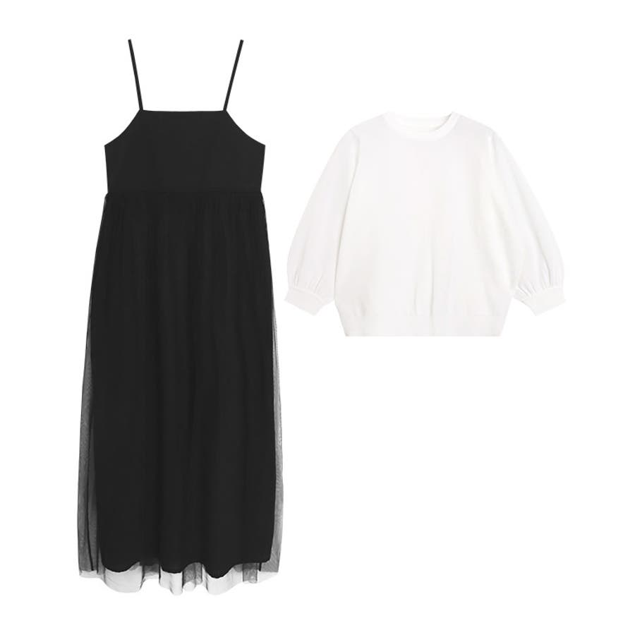 ワンピースの後ろ身頃は着脱のしやすさにもこだわったシャーリング仕様。チュール部分は生地を贅沢に使用することでボリューム感のある仕上がりに。ニットは7分袖でほんのり透け感もありながらも、体のラインを拾わずインでもアウトでも着られるので気分に合わせてスタイリングしていただけます。