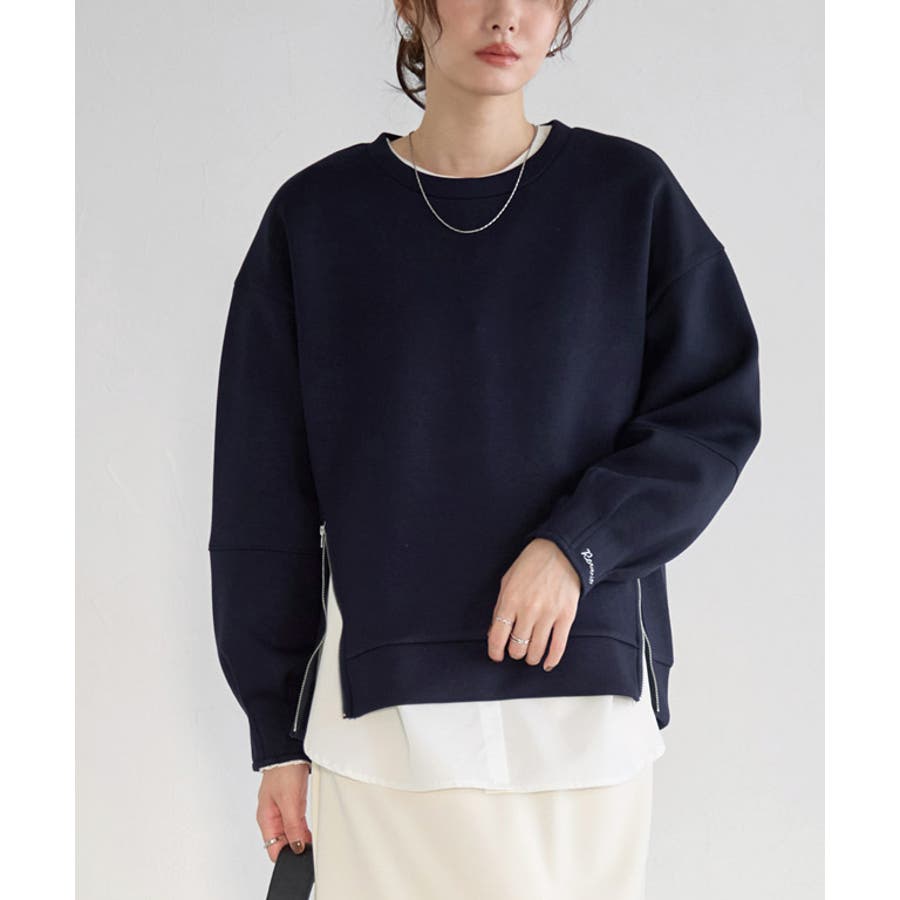 トレンド感のあるオーバーサイズシルエットに袖のボリュームで立体的なフォルムを演出したこなれ感漂うプルオーバー。袖に施した刺繍やサイドのジップデザインがカジュアルすぎず程よく女性らしい印象を与えてくれます。