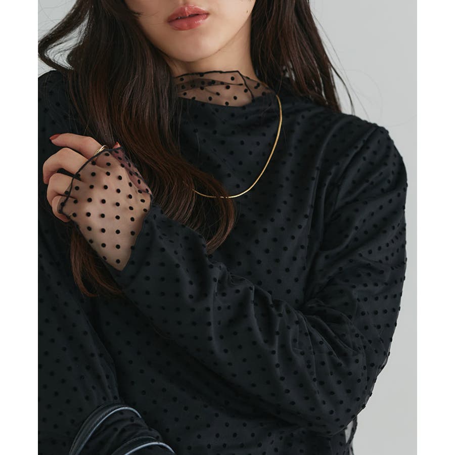 程良いハイネックデザインでインナーとしても使いやすい一枚。首元、袖口、裾はチュール生地を長めにしているので適度な透け感がおしゃれ見えするところもポイント。一枚ではもちろん、ベストやジレなどのインナーとしてもアクセントになるアイテムです。