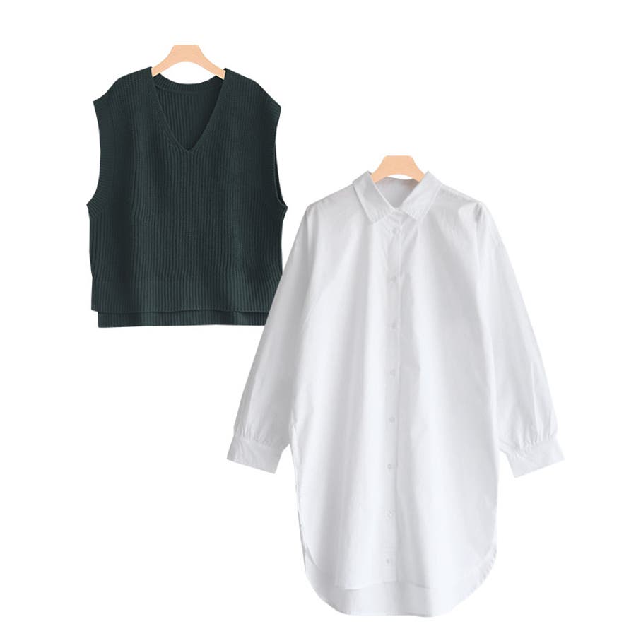 ややゆるめのサイジングで仕上げたニットベストはお手持ちのアイテムとも相性◎ロングシャツは旬のレイヤードスタイルが簡単に叶えられる優秀アイテム。セットではもちろん、どちらも単品使いができるアイテムなのでスタイリングの幅が広がります。