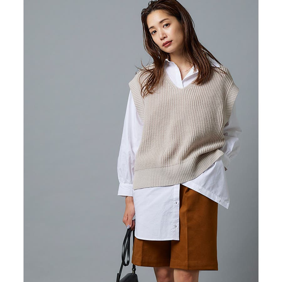 ベストは柔らかな風合いでざっくりとした畦編み。シャツは綿100%なのでさらりとした着心地が魅力的です。