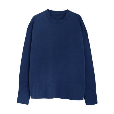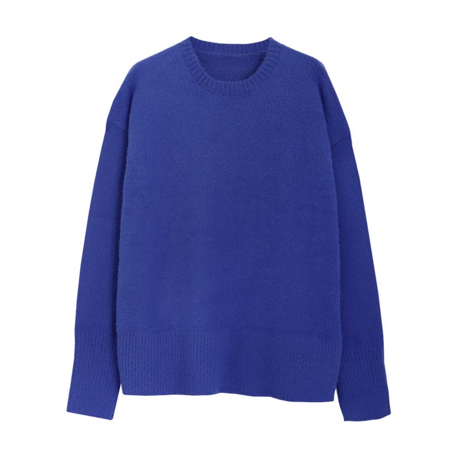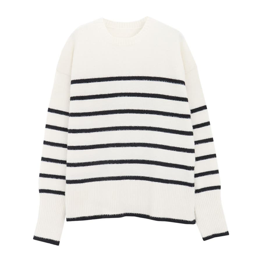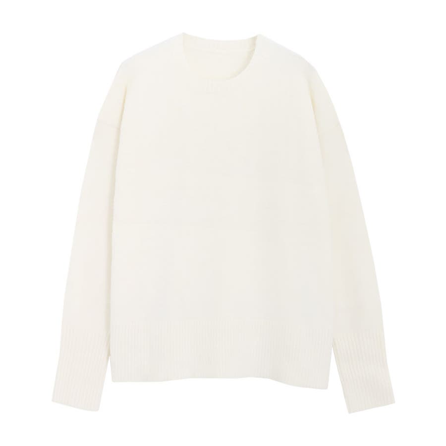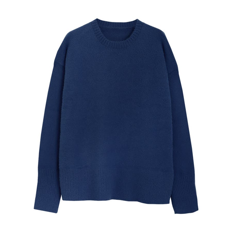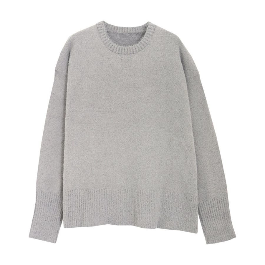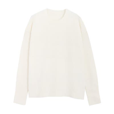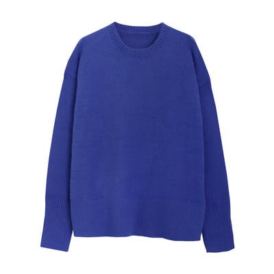 指穴デザインがトレンドライクな一枚。首元がすっきりと見えるクルーネックデザインと、レディライクな印象のVネックの選べる2typeも嬉しいポイントです。シャギー糸と引き揃えた編み地で、ふんわりと温かみのあるニット。袖や裾は長めのリブ仕様になっており、さりげないアクセントに。