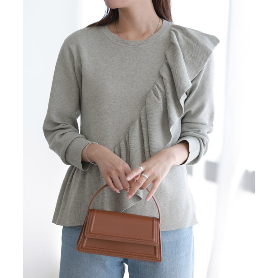 肩から斜めにデザインしたラッフルが魅力のプルオーバー。大ぶりのフリルがコーデの主役になる一枚です。シンプルなボトムスと合わせるとすっきりとした印象に◎甘めなスタイルが苦手な方はデニムと合わせてカジュアルダウンしたコーデがおすすめです。