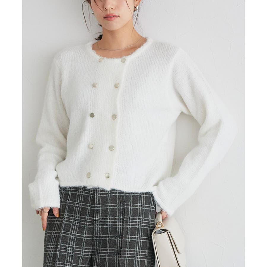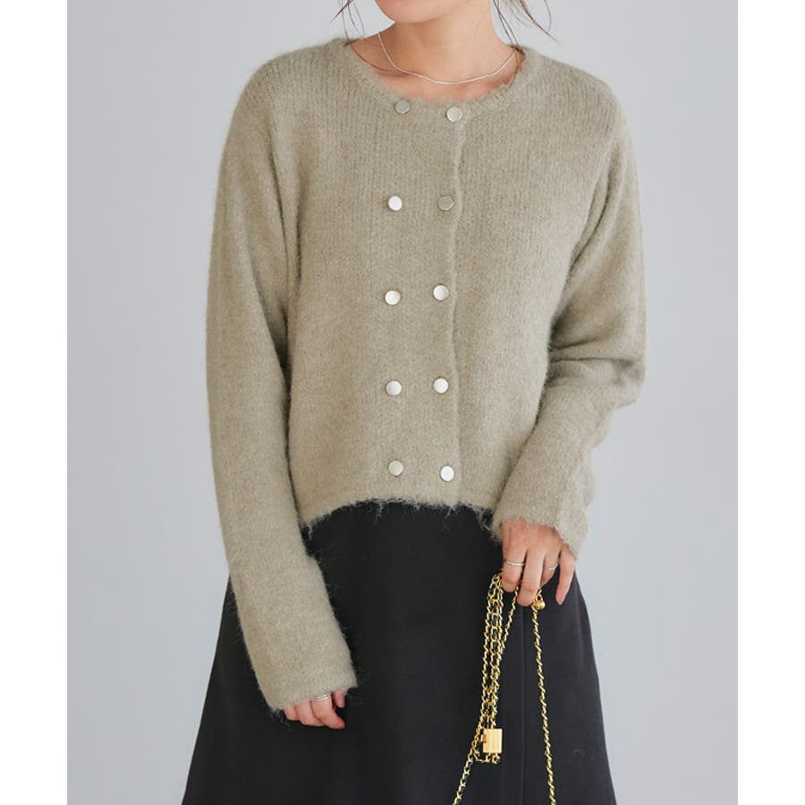 トレンドの短丈にシャンパンゴールドのボタンを2列あしらうことで、ジャケット見えするようなデザインが魅力。トップス着用をメインとしたアイテムですが、カーディガンとしても使いやすい丈感にこだわりました。