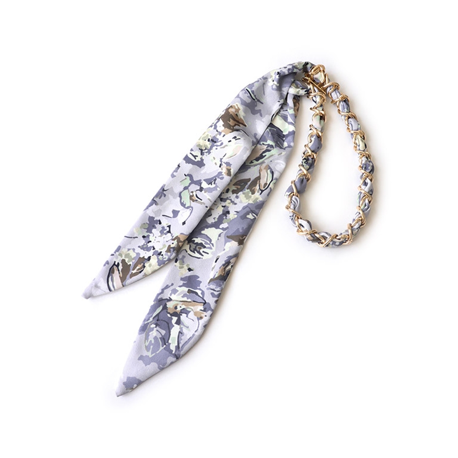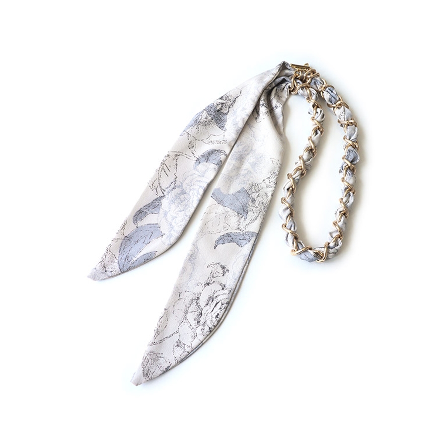女性らしい柄が魅力のスカーフコンビチェーンネックレス。程よいボリュームが顔周りを華やかに見せ、大人フェミニンな印象に導きます。スカーフの先をタイ結びにして前後で着用も可能です。ネックレス以外にも、ヘアアクセ、バッグチャームとしてマルチに使えるのも嬉しいポイント。