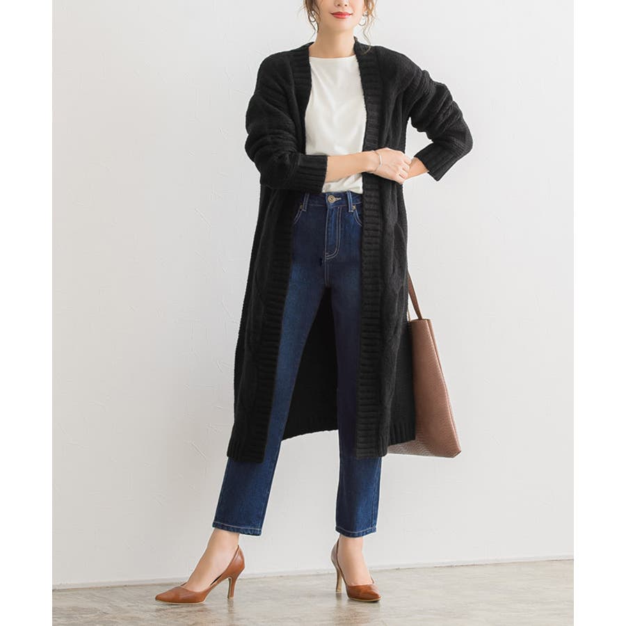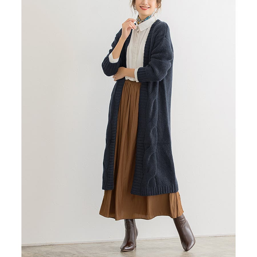 ウール混ケーブル編みロングニットカーデ アウター カーディガン ロングアウター