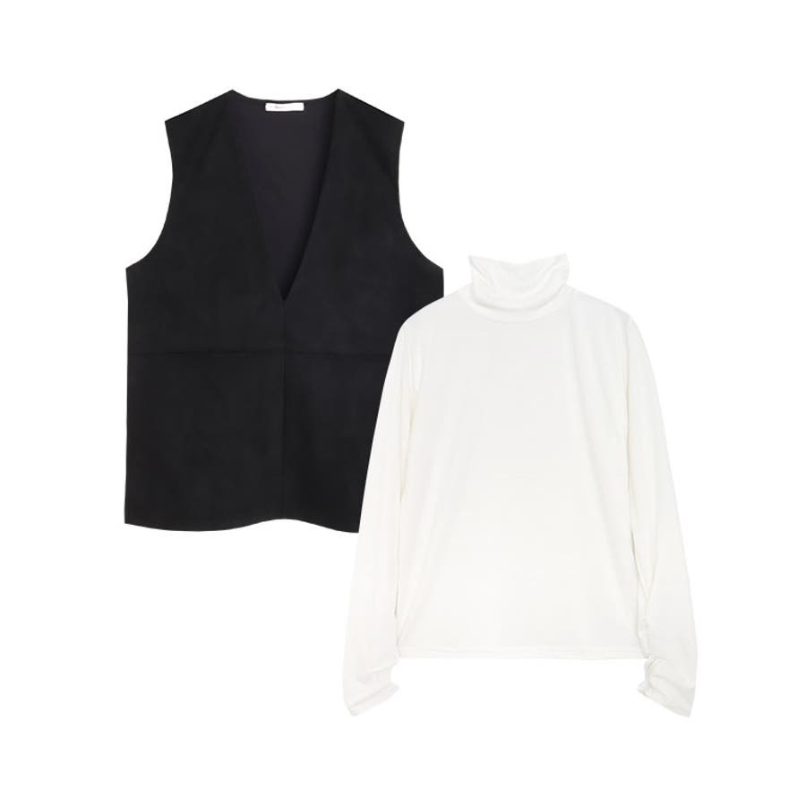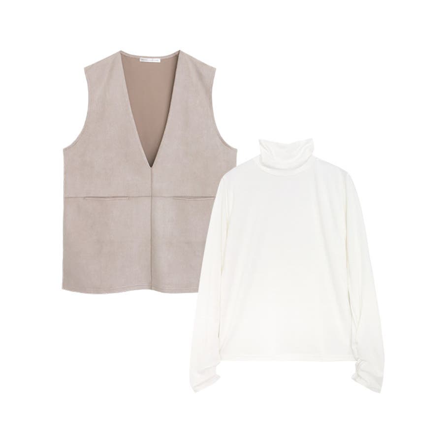 ベストは深めのVネックなのでインナーを選ばず合わせやすく、インナー次第で長く着回せるアイテムです。インナーは袖部分に施したシャーリングデザインが、シンプルながらもアクセントに。さりげないシャーリング使いが、こなれ感を引き立ててくれます。