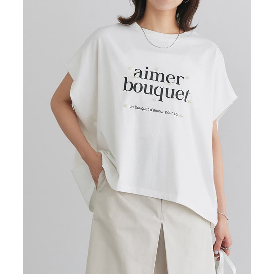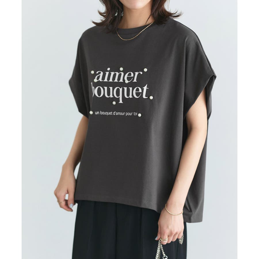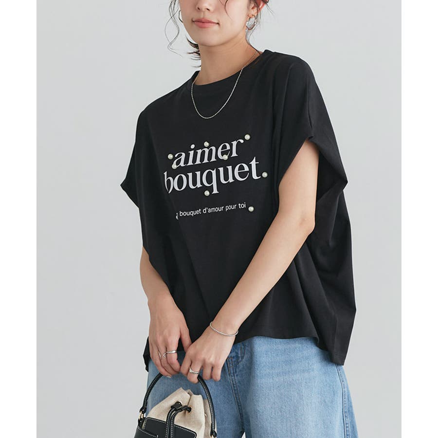 贅沢に用尺を取ったドルマンデザインで、体型カバーしながらもラフな着こなしが可能です。大人シックな明朝ロゴにイミテーションパールをあしらい、フェミニンさをプラスした一枚。