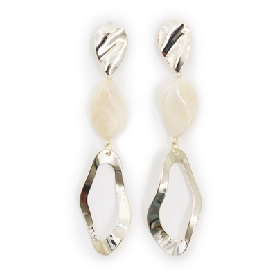 トップのメタルパーツは波状の加工のものとドロップリングのもので存在感をプラス。中央にマーブルの変形パーツをあしらうことで、単調にならず大振りデザインながらもトレンド感のあるデザインに仕上げました。