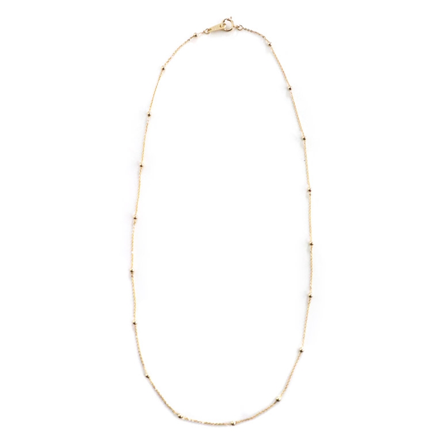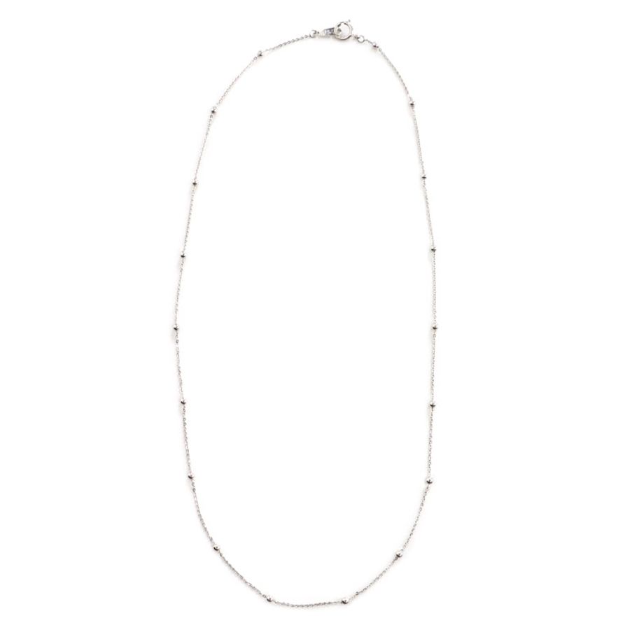 等間隔にあしらわれたビーズデザインのチェーンが女性らしいさりげない印象をプラスします。スタイリングに馴染みやすい繊細さも魅力ポイント。