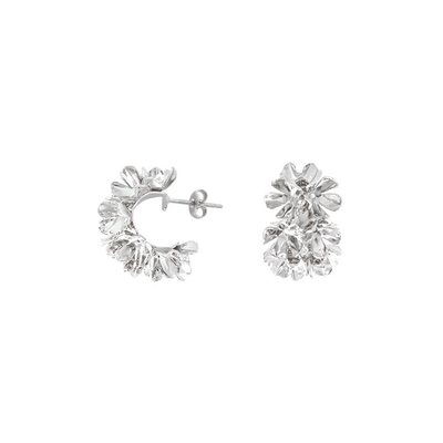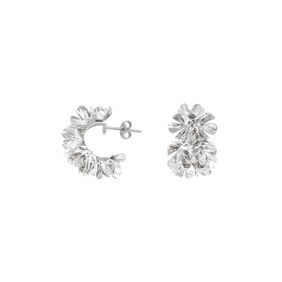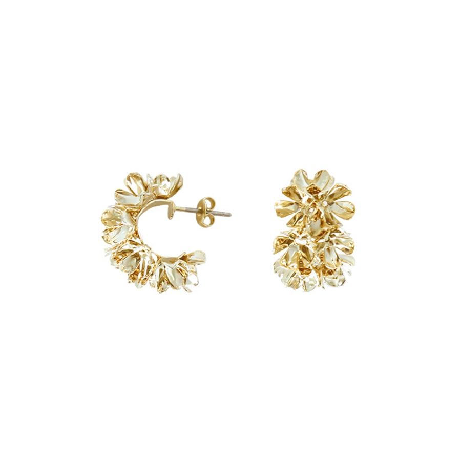シンプルな花びらパーツをたくさん寄せ集め、フープ上にくみ上げたピアス。