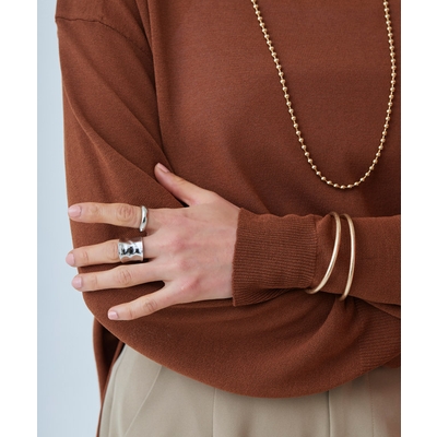 程よくアクセントになる太さの線形バングルで、コーティングは表面にマットな質感のバレル加工を施し、クラフト感のある印象に。