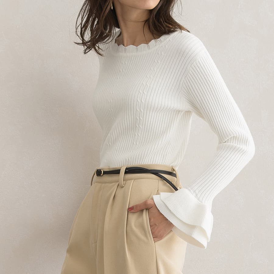 袖フレアリブニット ニット リブニット ケーブルニット 袖フリル 袖フレア