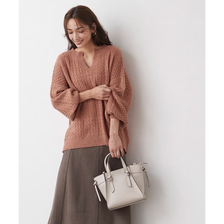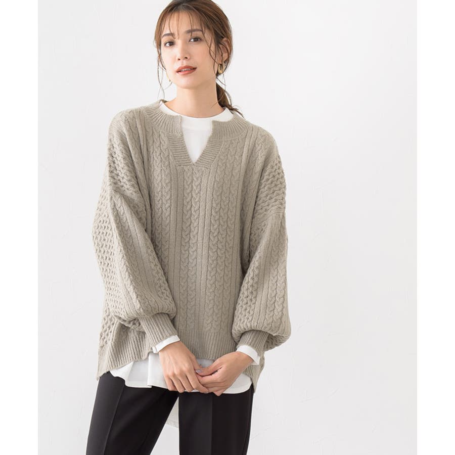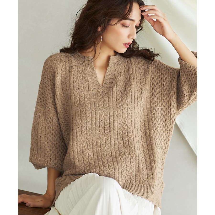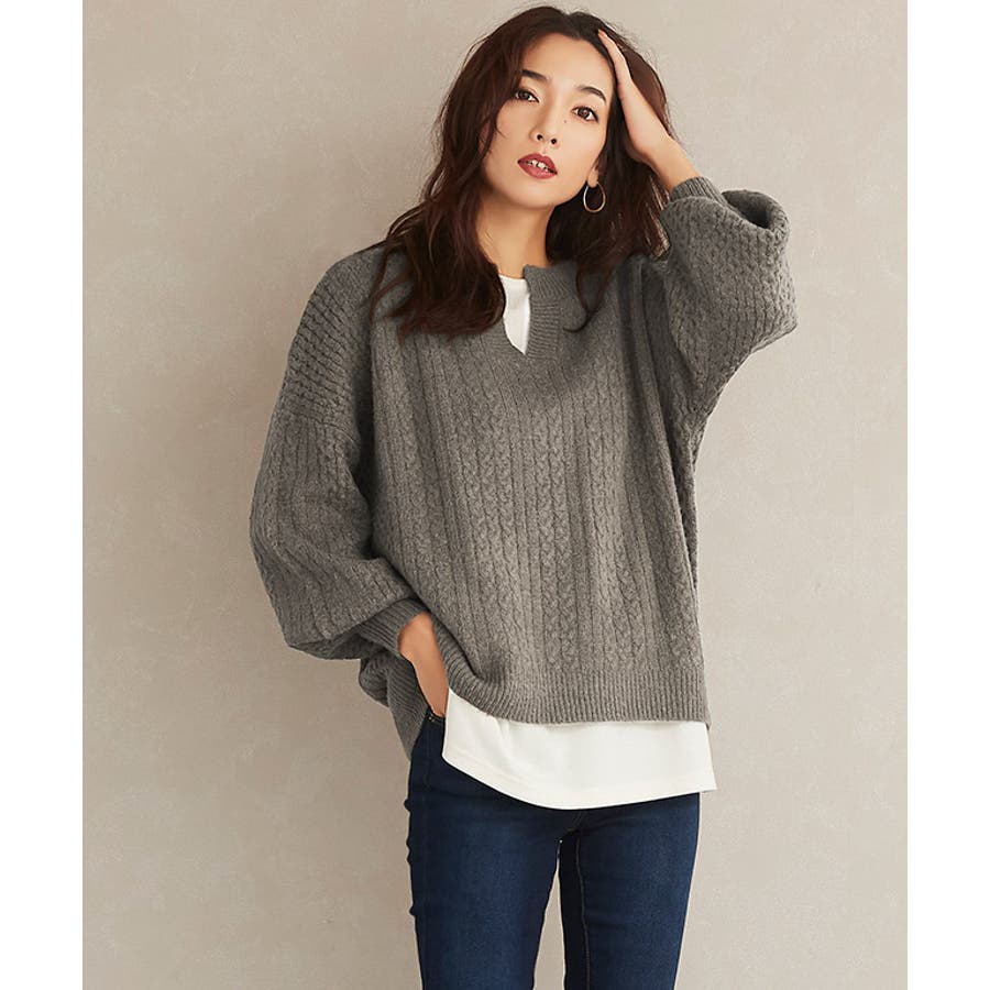 キーネックケーブルニット キーネック ケーブルニット リブニット ドルマンスリ