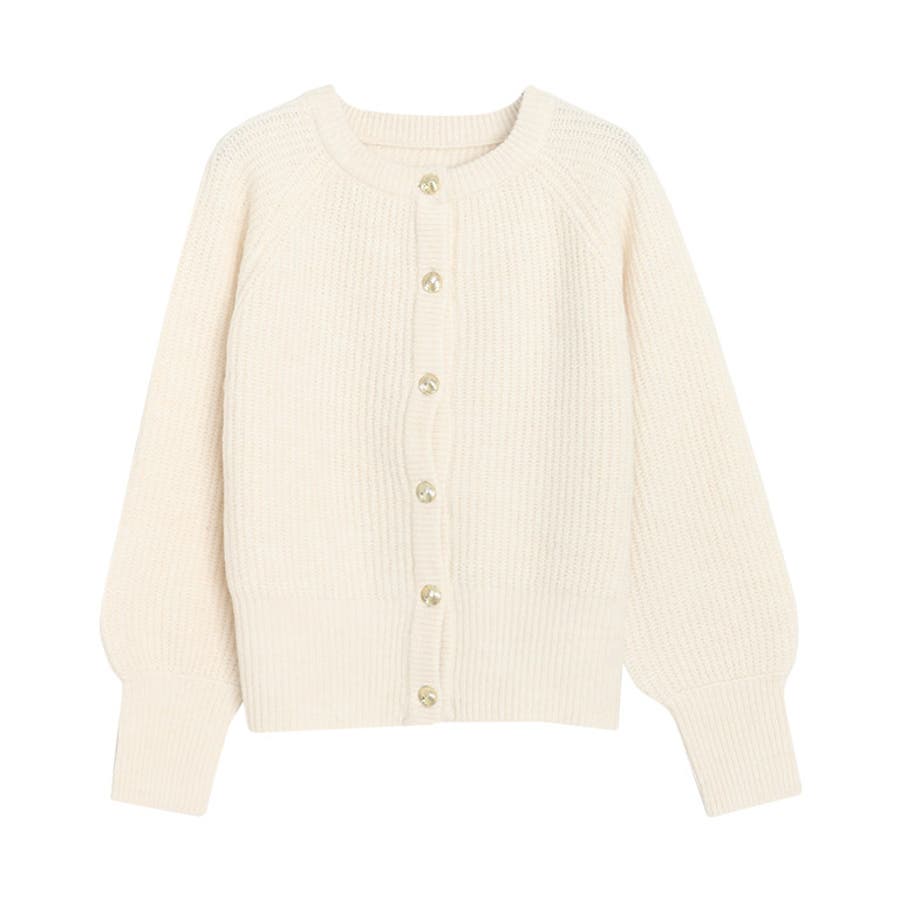 レトロな雰囲気溢れるゴールドのデザインボタンがアクセントになったニットカーディガン。片畦編みとラグランスリーブがカジュアルなスタイリングにマッチします。袖と裾のリブを長めにすることでボリュームが際立ち、メリハリのあるぽわんとしたシルエットを作り出します。