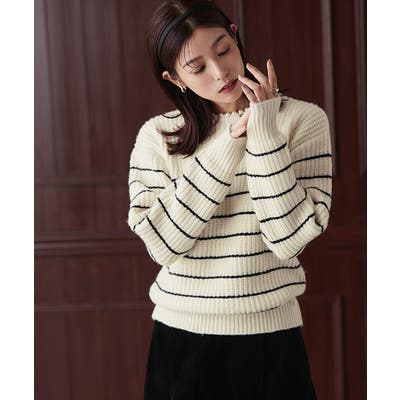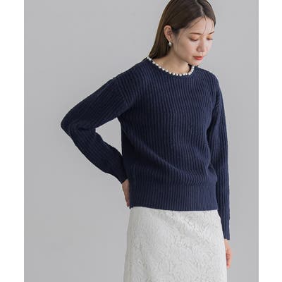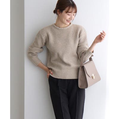 ネック周りにあしらったパールが顔周り~デコルテラインまで、華やかに彩ってくれるデザイン。パールが相まってカジュアルになりすぎず大人っぽくスタイリングを完成させてくれるニットプルオーバーです。しっかりと厚みのあるニットなので、大きくなりすぎないよう工夫の詰まったサイジング。