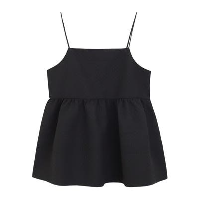 胸下から広がるペプラムデザインが女性らしく、腰周りの体型カバーにも◎細いストラップが華奢見えし、アジャスターで調整も可能。インナー次第でシーズンレスに着られて、旬のスタイルに仕上げてくれる一枚です。