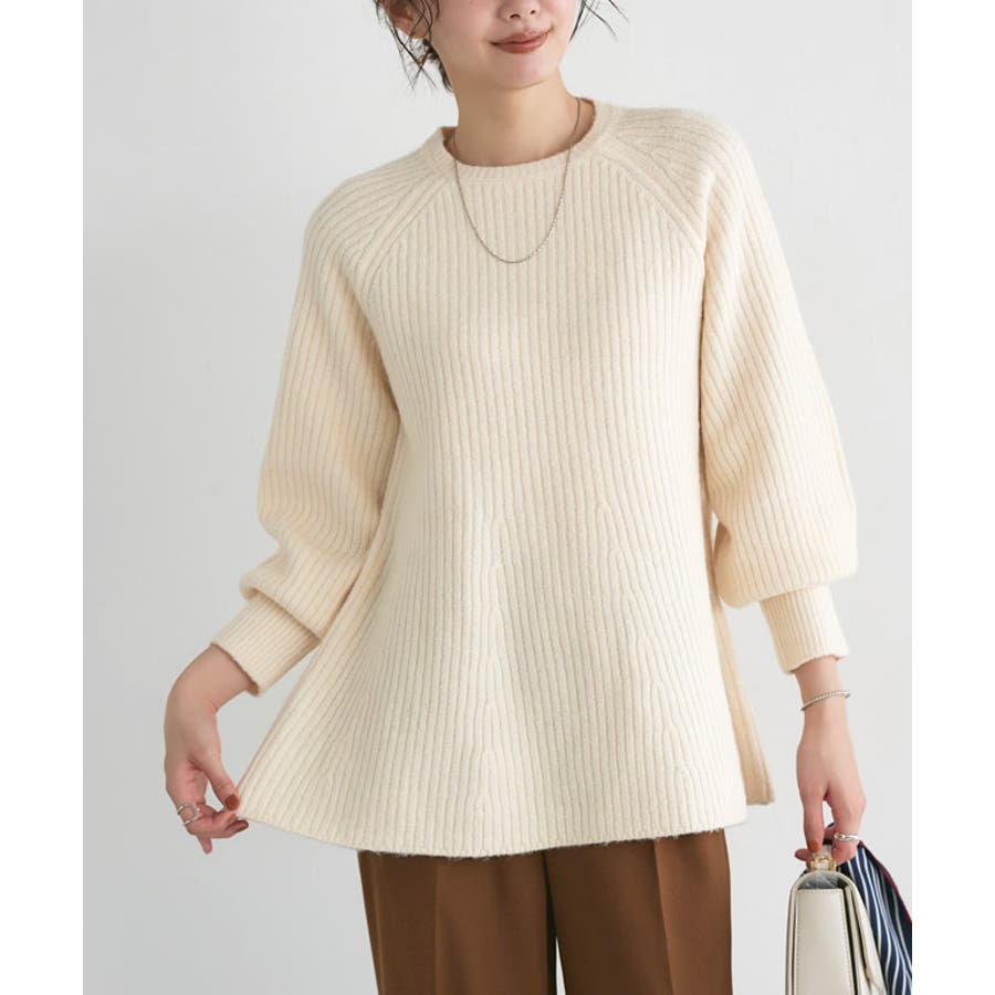 裾に向かってふんわりと広がるフレアシルエットがフェミニンな一枚。ウエスト周りの体型カバーもしてくれるところも嬉しいポイント。長めにした袖のリブからボリュームのある袖や、ラグラン切り替えで丸みのある女性らしい雰囲気をプラスし、一枚で着映え感のあるように仕上げました〇