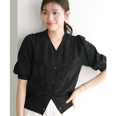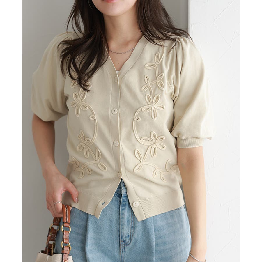 お花のようなコード刺繍が女性らしくトレンドライクな印象のニットカーディガン。立体的な刺繍が同色ながらもアクセントになってくれます◎前を閉じてトップスとしてはもちろん半袖の羽織りとしても着回せる一枚です。