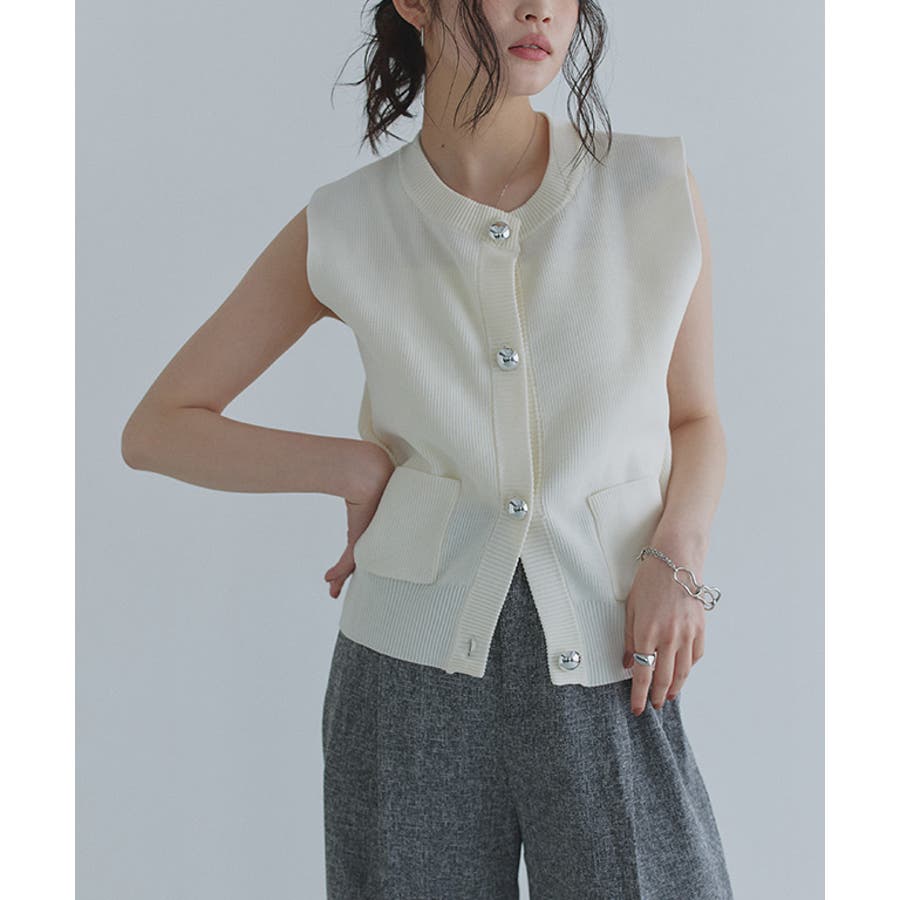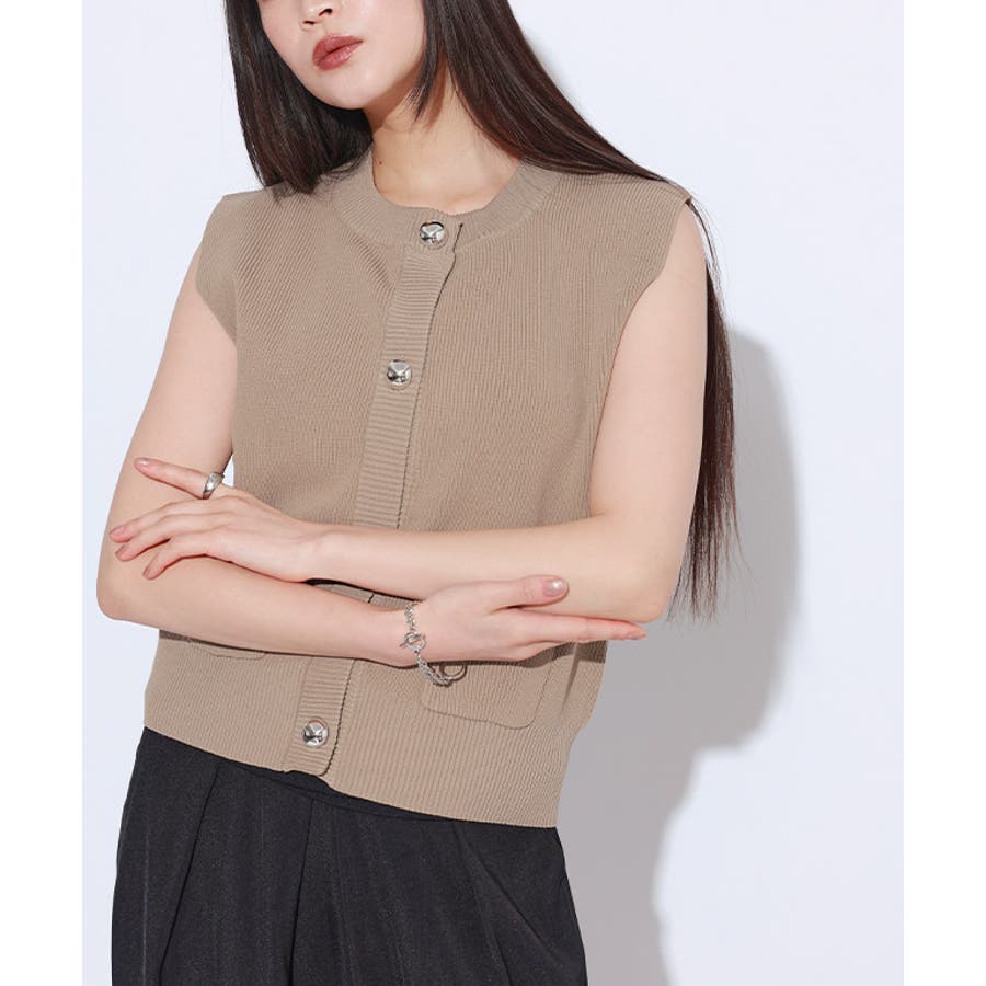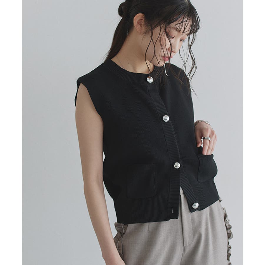 フロントに施したBIGボタンがコーデのアクセントになるニットベスト。ノースリーブデザインが軽やかさと、抜け感を演出します。程よく短めの着丈が今っぽい印象に。