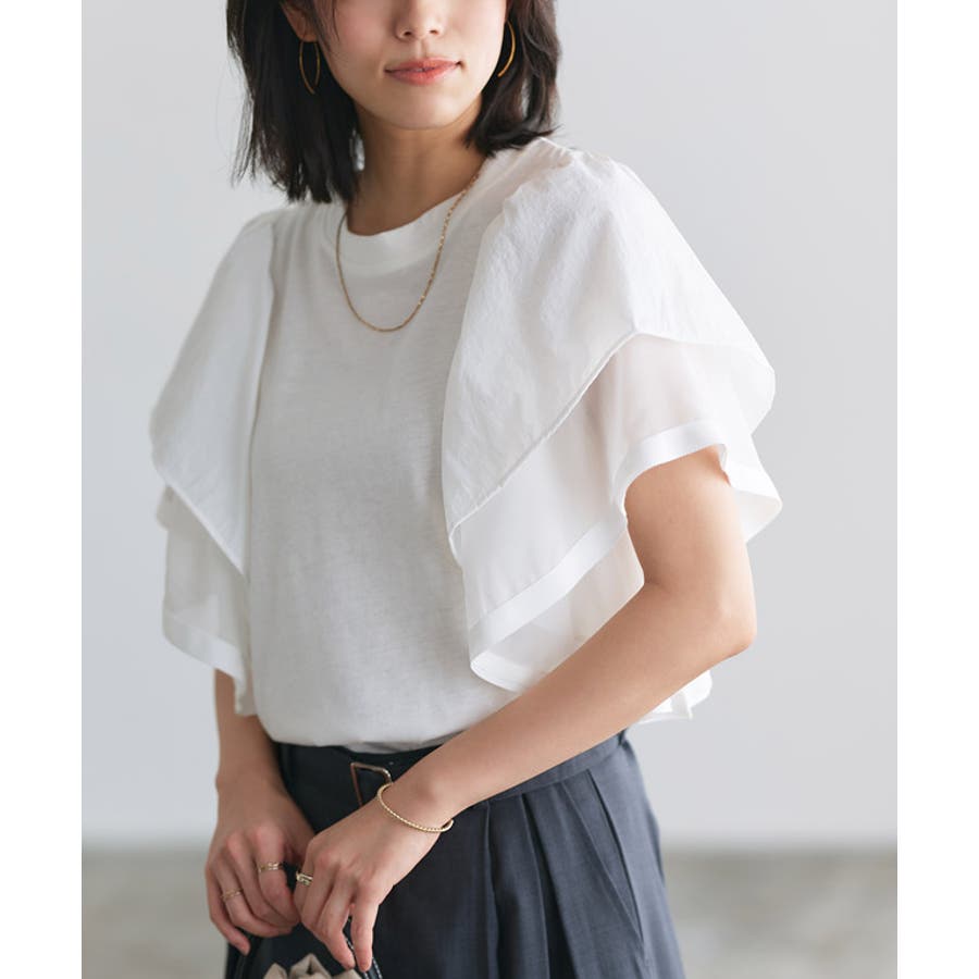 身頃はカットソー素材で着心地が良く、綿混でサラッとした肌触りに。ハリ感のあるナイロン素材、透け感のあるシフォン素材の異素材と組み合わせることでおしゃれな雰囲気に仕上げてくれます。
