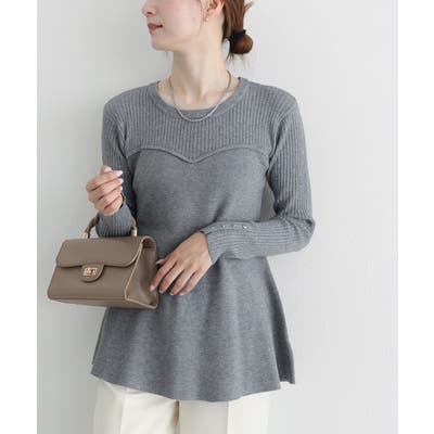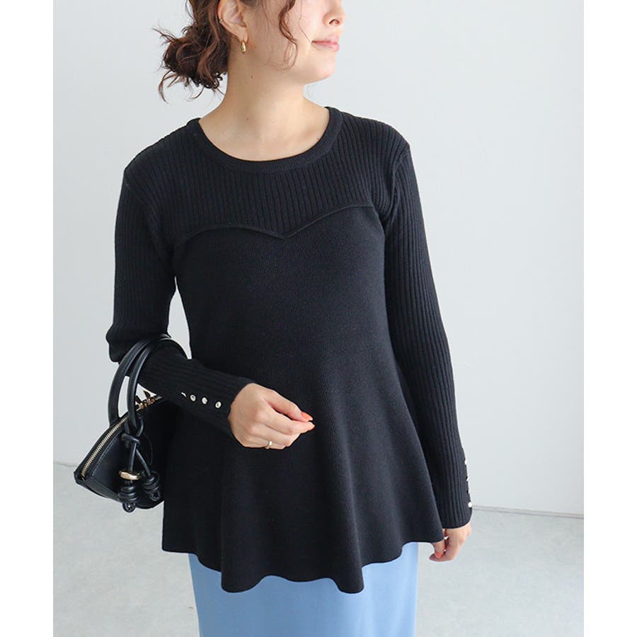 まるでビスチェを重ねたようなデザインが目を惹くニットトップス。ペプラムシルエットが自然に腰回りをカバーし、女性らしい立体感を演出します。袖口のゴールドボタンがさりげないアクセントになり、トレンド感のある一枚です。