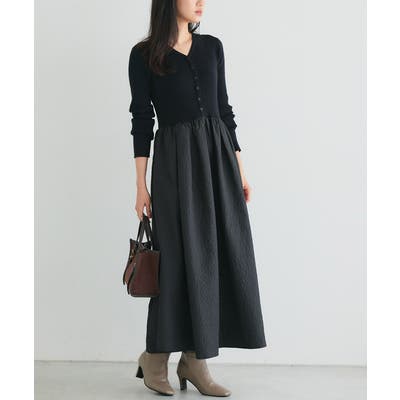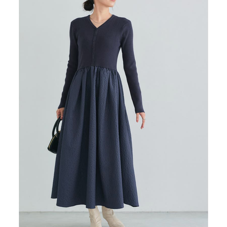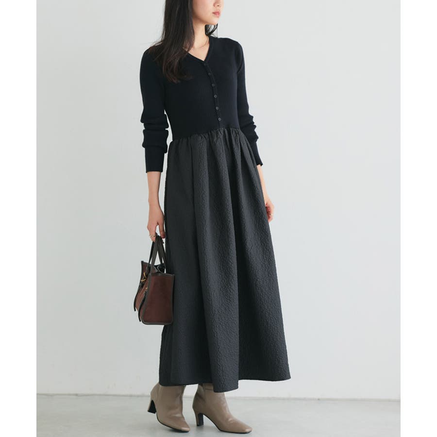 もちもちとした肌触りのリブニットと、凹凸感のあるジャカード素材を組み合わせたドッキングワンピース。見頃のリブ編みですっきり見え、スカート部分のジャカード素材がトレンド感を演出します。