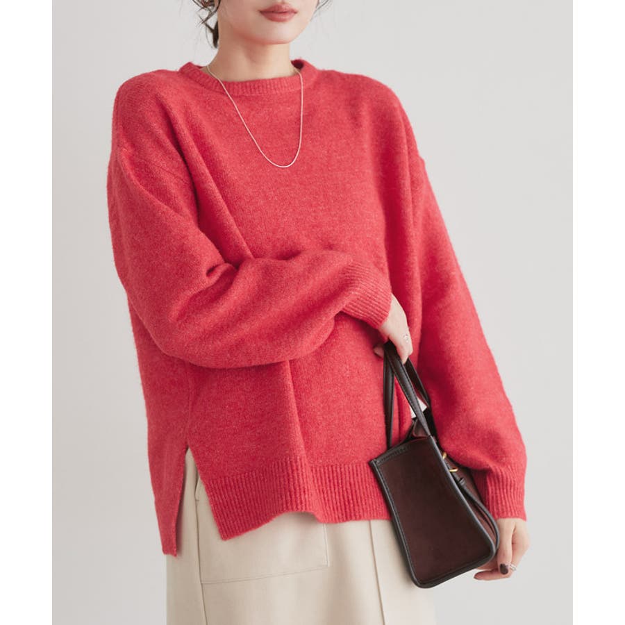 体のラインを拾わないゆったりシルエットに、サイドスリットで抜け感をプラス。ややボリュームをもたせた袖が女性らしさを演出します。首元はクルーネックで、シャツやTシャツとのレイヤードスタイルにも相性抜群。ボトムスを選ばず、着回し力の高い一枚です。