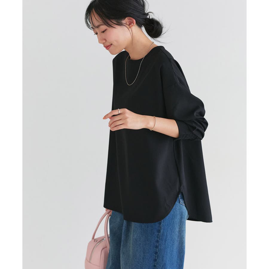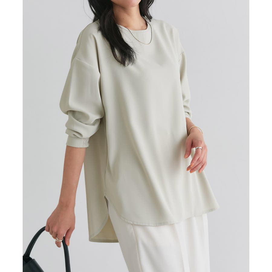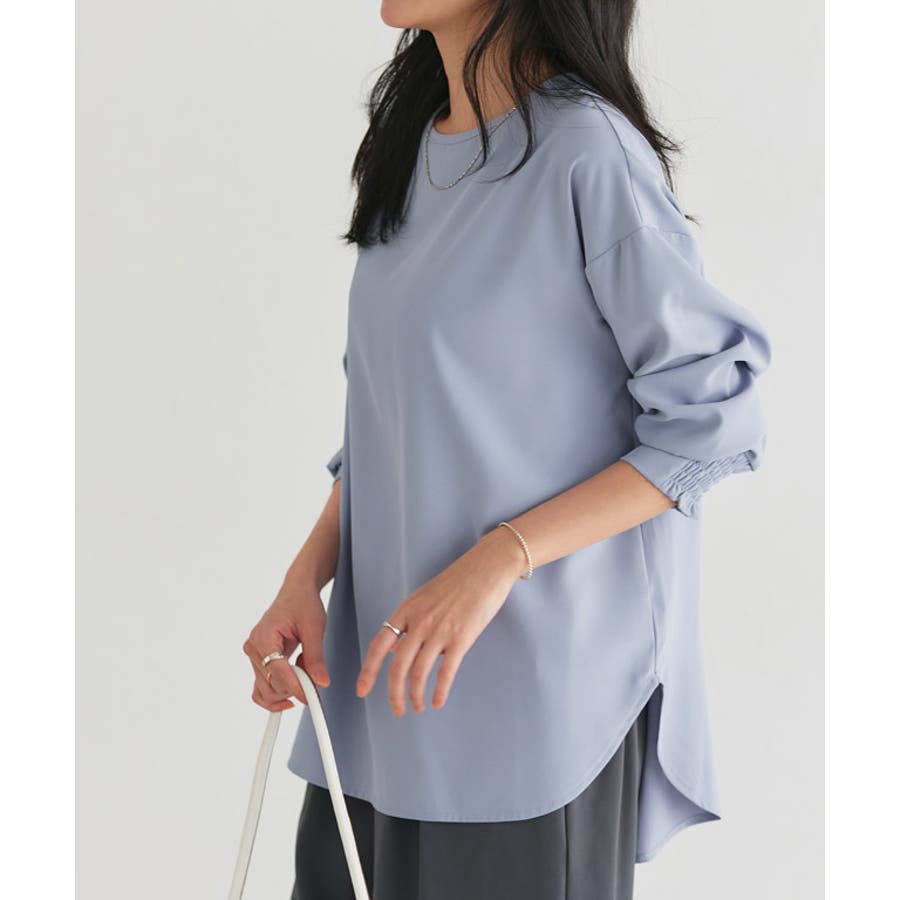 ロンT感覚で気軽に着られながら、きちんと見えを叶えるTブラウス。ドロップショルダーとオーバーサイズでゆったりとした着心地に。サイドスリット入りでフロントインもしやすく、こなれ感のあるスタイルに仕上がります。袖口はシャーリング仕様で、まくるだけで自然な立体感に◎