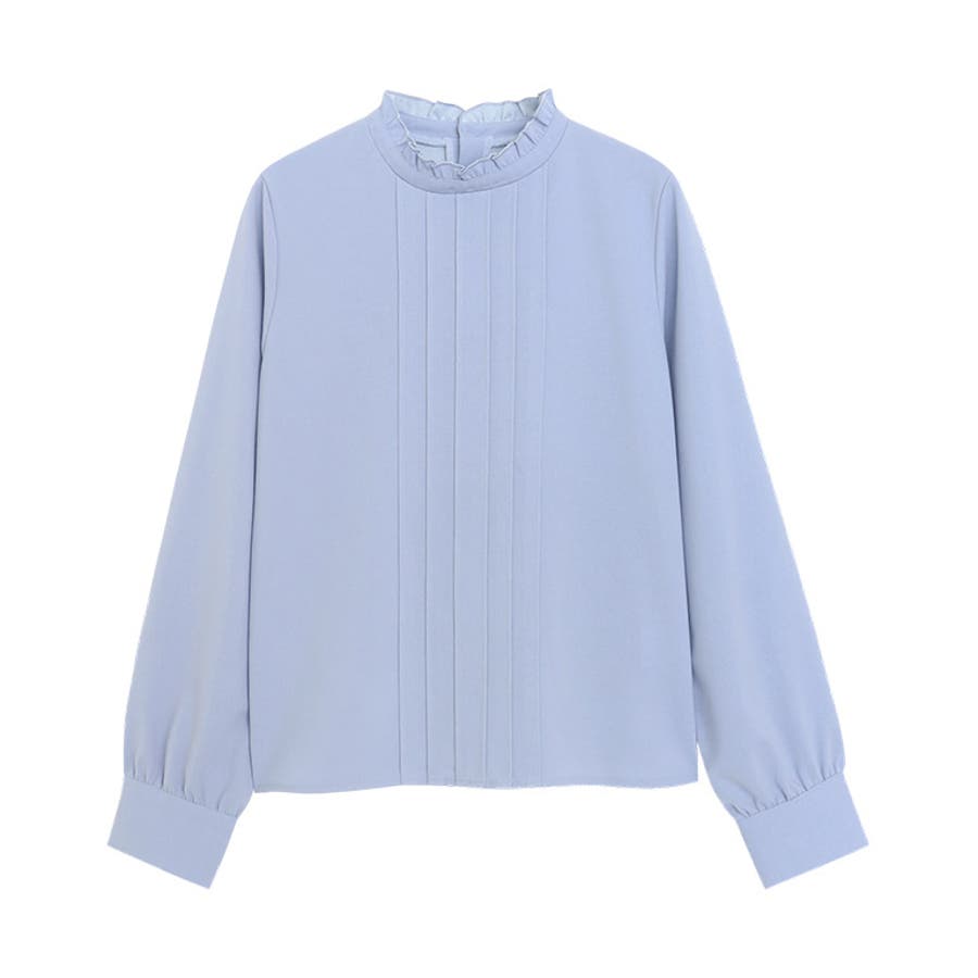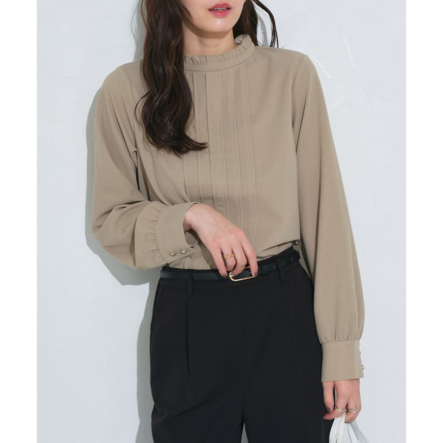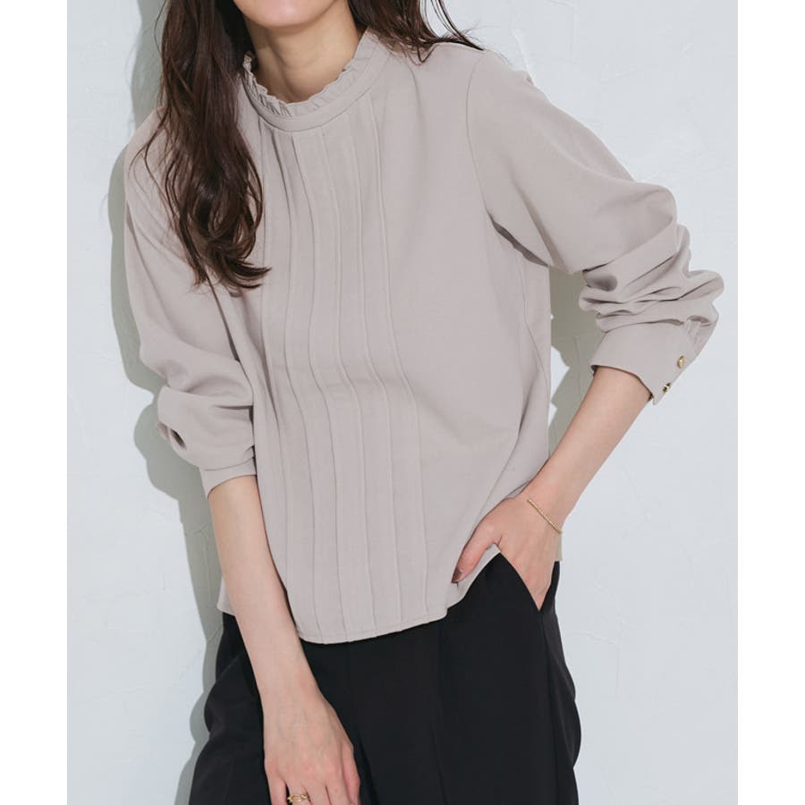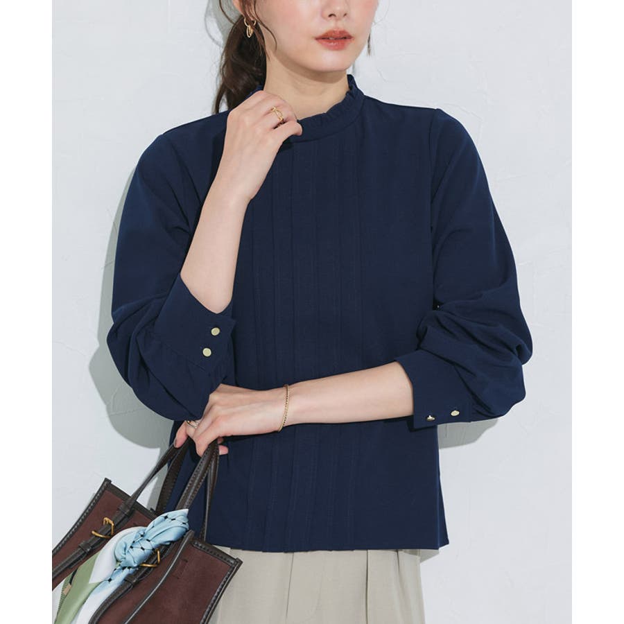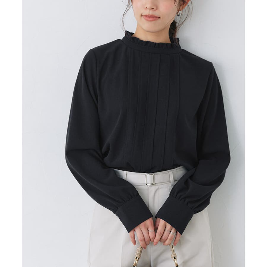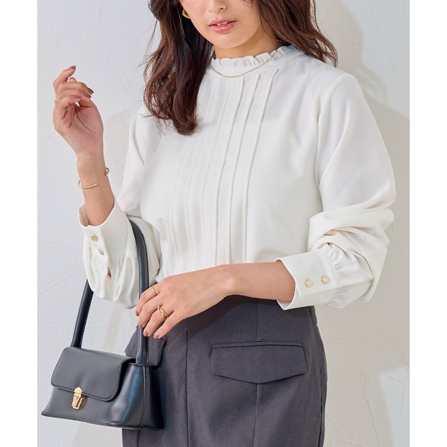 前身頃に施したタックが、華やかな印象に導くデザインTブラウス。程良くボリュームのある襟のフリルが女性らしさを高めてくれます。