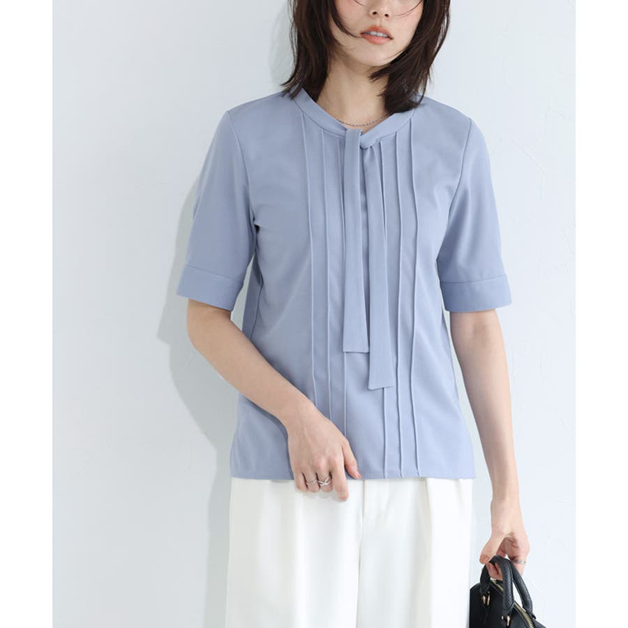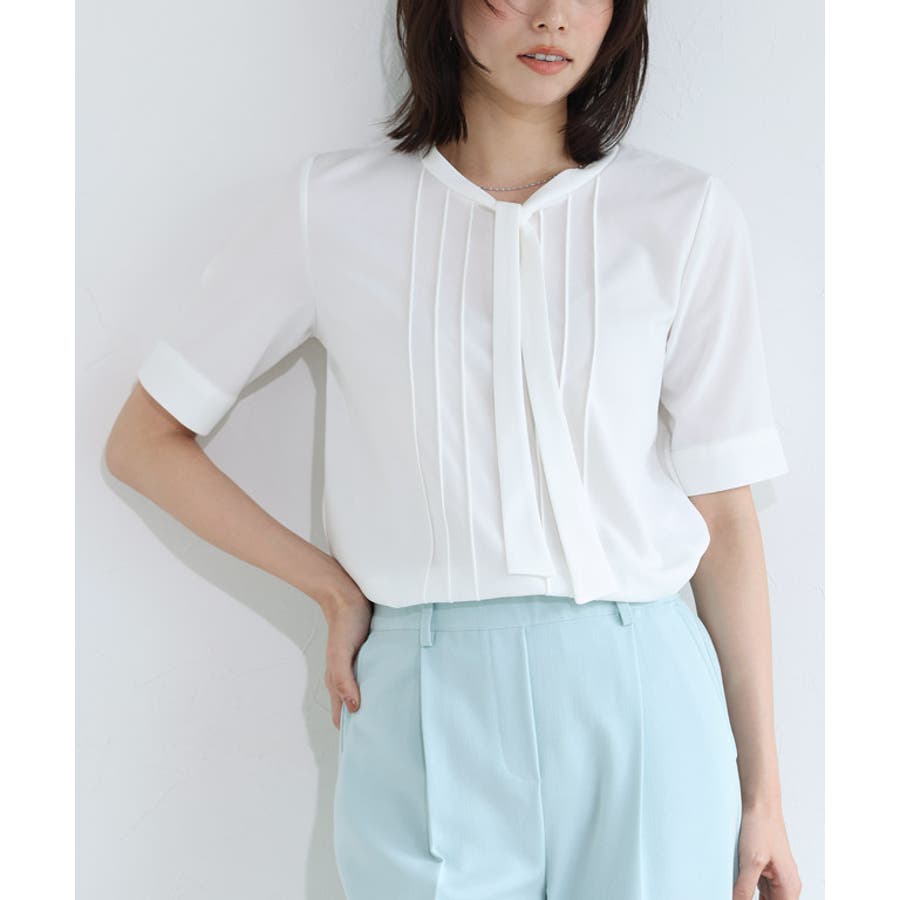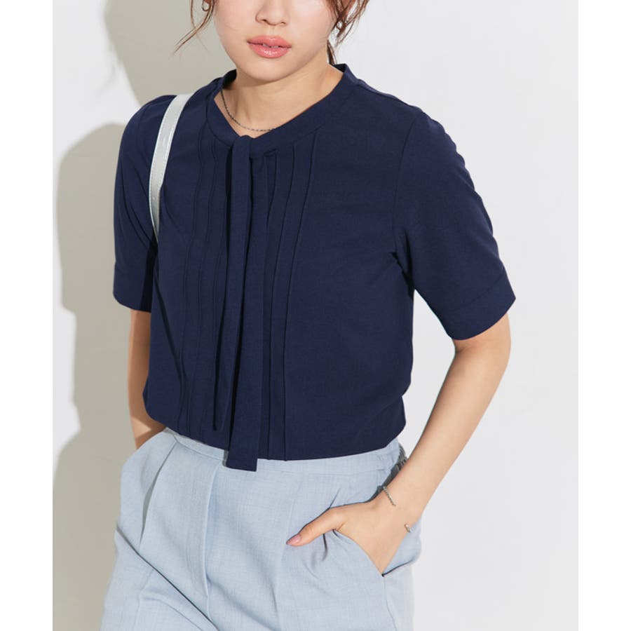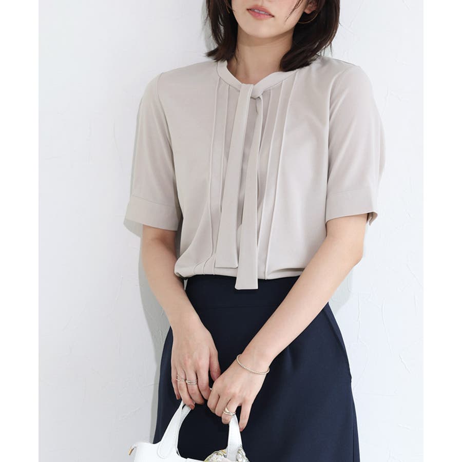 ピンタックがきちんと感のあるブラウス。タイデザインがインナーとして着用した際もアクセントになってくれ、オフィスシーンで活躍する上品ブラウスです。