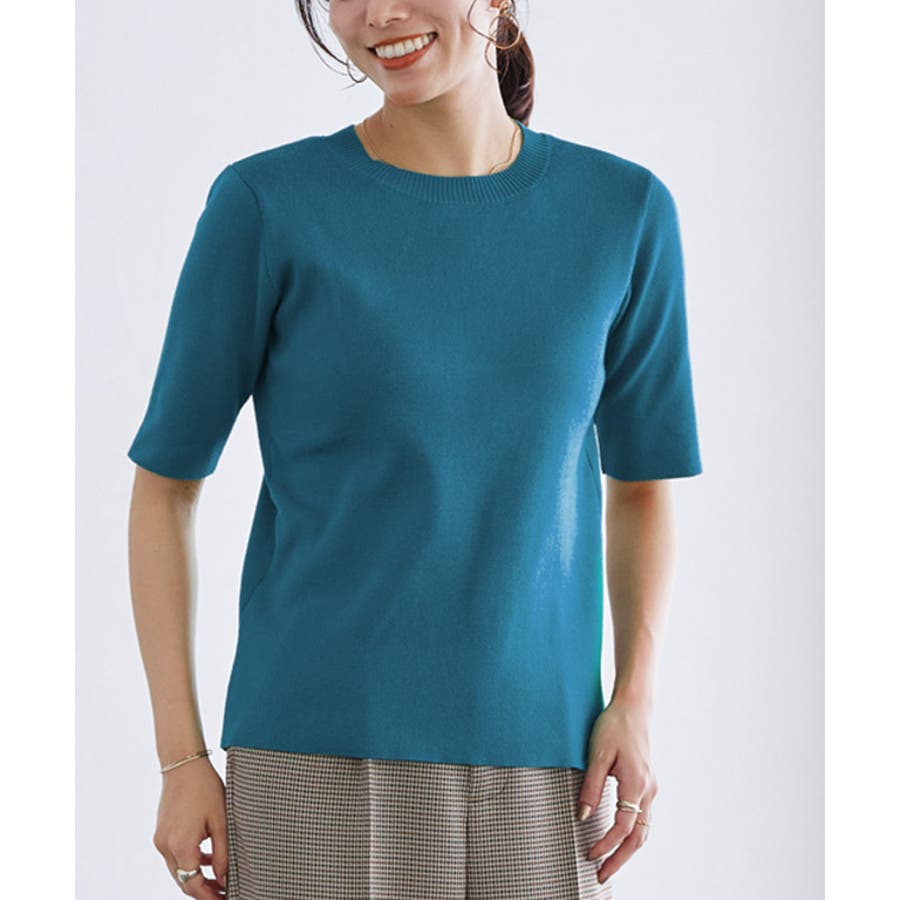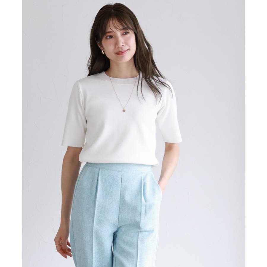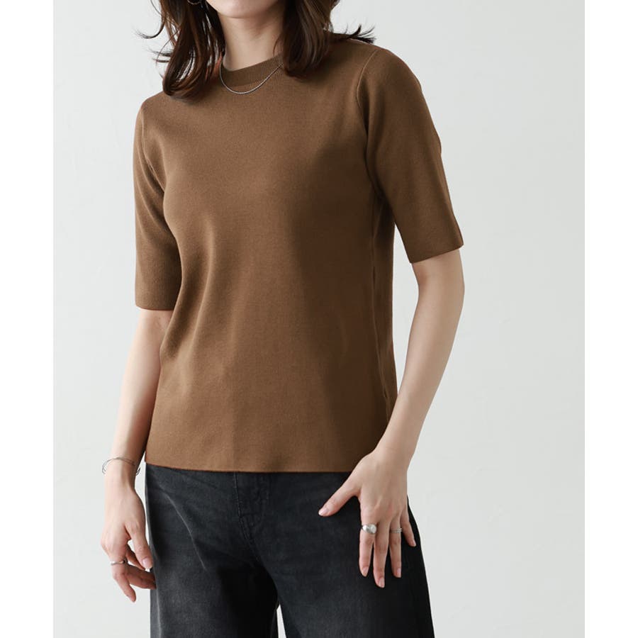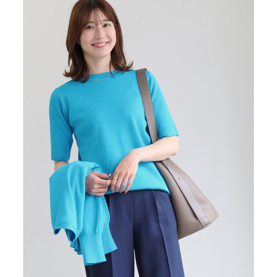 腕周りを細く見せる五分丈袖と、程よく詰まったネックラインがバランスの良い仕上がりに。しっかりとした総針編みで厚みをもたせ、体のラインを拾わないのも嬉しいポイントです。単体で着用するのはもちろん、同素材のカーディガンとアンサンブルでも着用もオススメのスタイリング。