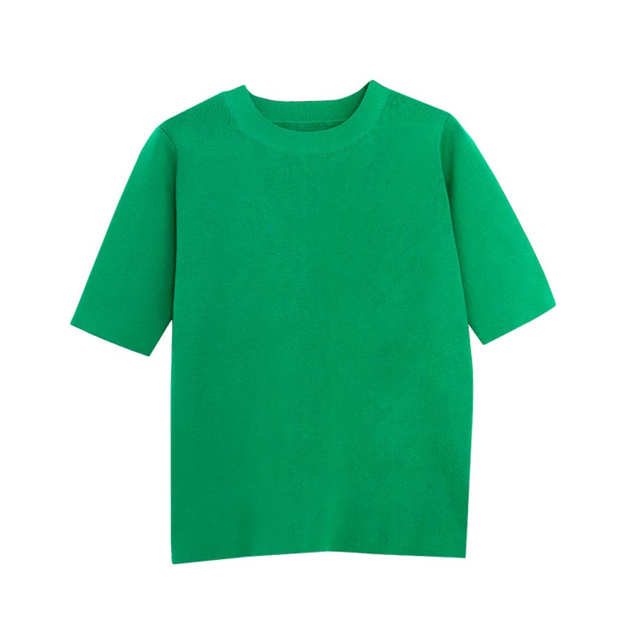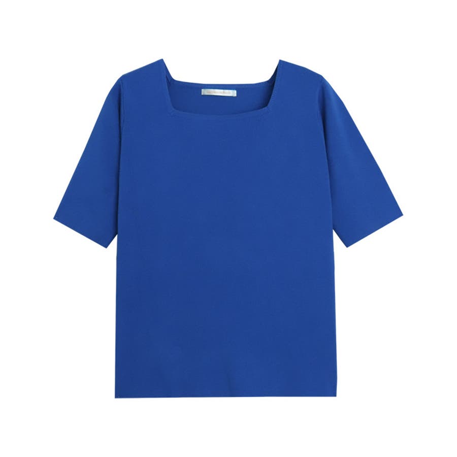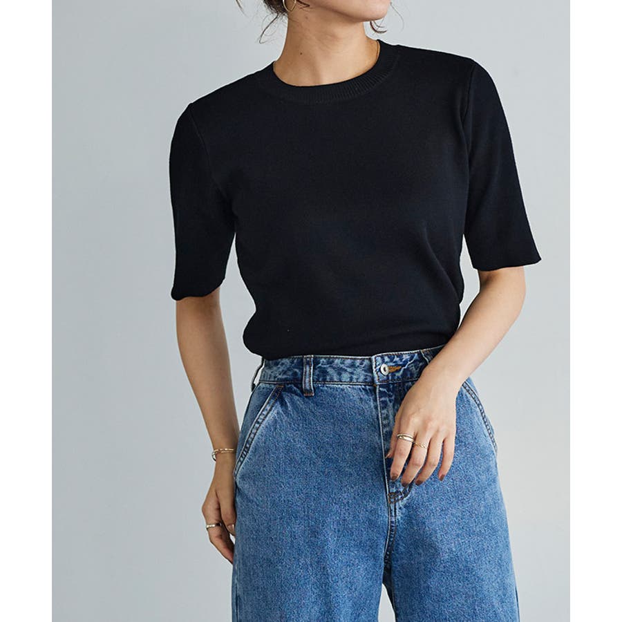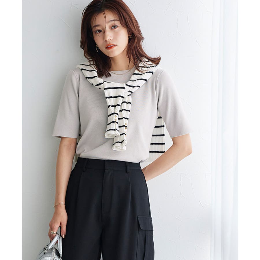 腕周りを細く見せる五分丈袖と、程よく詰まったネックラインがバランスの良い仕上がりに。しっかりとした総針編みで厚みをもたせ、体のラインを拾わないのも嬉しいポイントです。単体で着用するのはもちろん、同素材のカーディガンとアンサンブルでも着用もオススメのスタイリング。