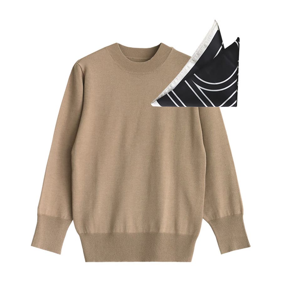 また、ニット製品は生産の過程上「生地を織る際の糸の継ぎ目」繊維の「混紡」、プレス加工、製品洗い加工によって形やサイズ(5cm前後)に誤差が生じる場合がございますが品質上の問題はございません。