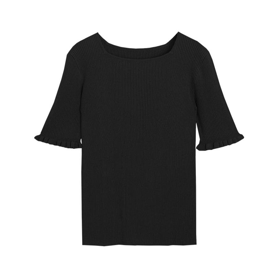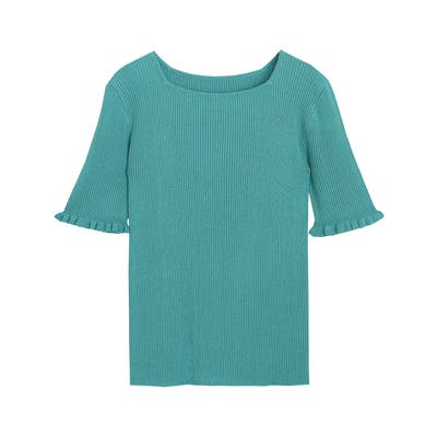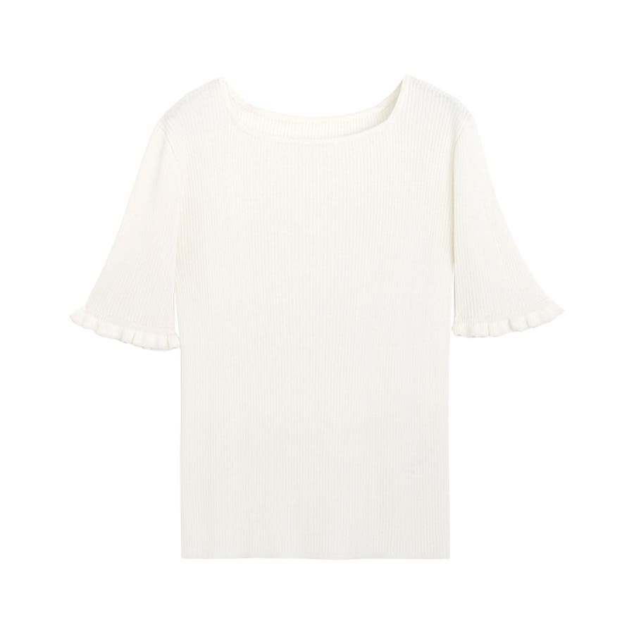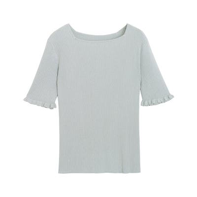 袖口にフリルを施し、程良くフェミニンな印象に仕上げたサマーニット。さりげないフリル使いがコーデのアクセントになり、シンプルながらも女性らしさを引き立ててくれます。身頃はコンパクトなサイジングなので、どんなボトムにも合わせやすい一枚です。